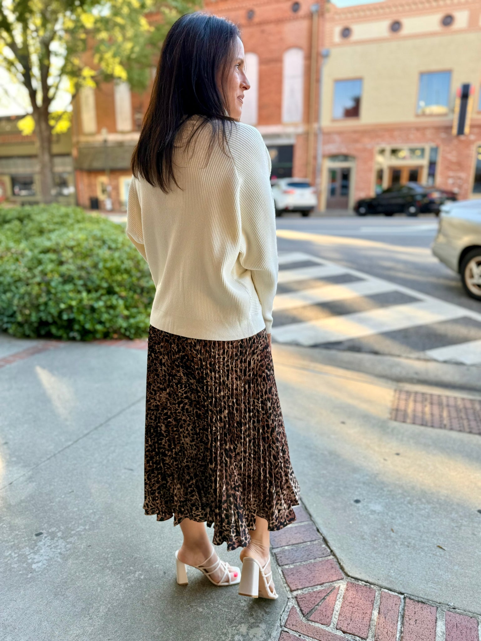 Crafted in soft pleated fabric, the midi skirt features a striking camel and black print that effortlessly captures the essence of fall. This flowy, mid-length silhouette sits comfortably at the waist and moves beautifully with each step, making it perfect for both casual days and dressed-up evenings. A versatile piece with timeless appeal!