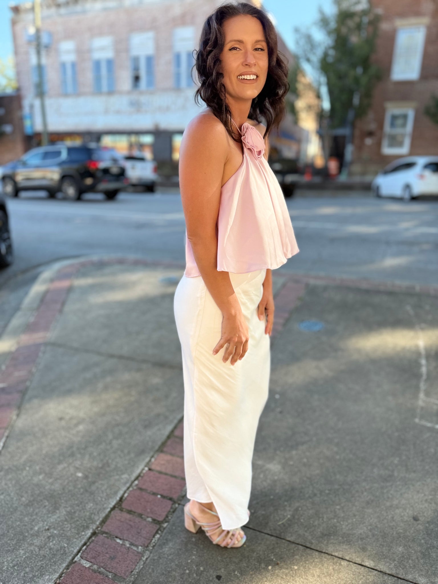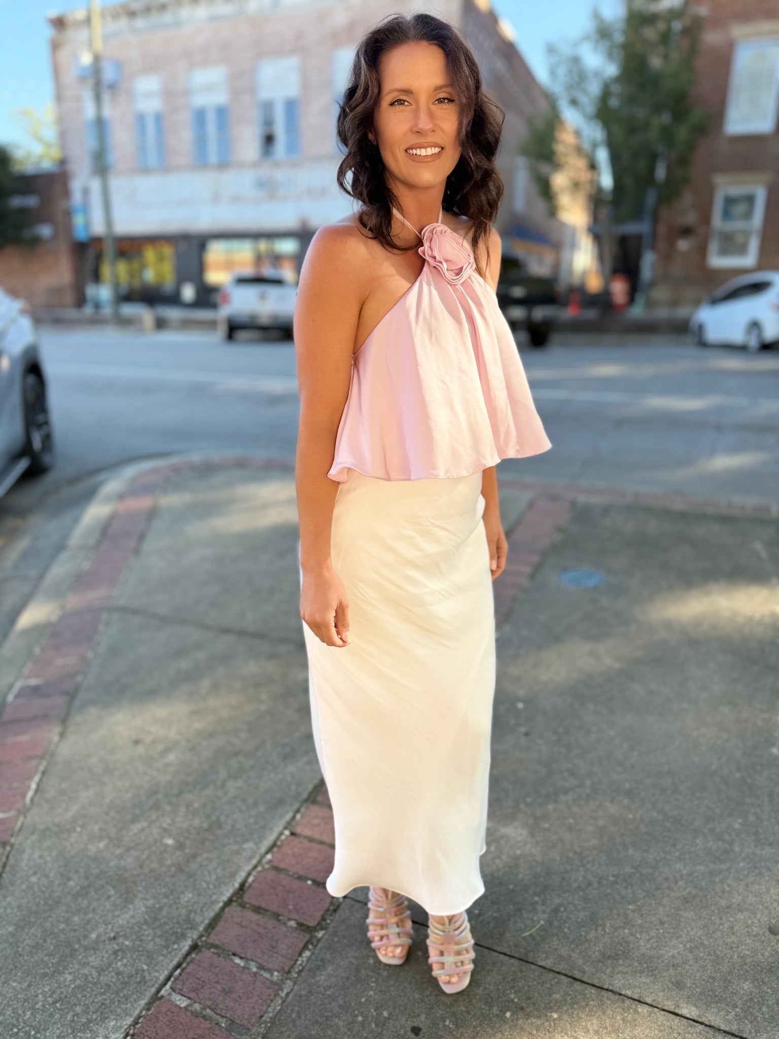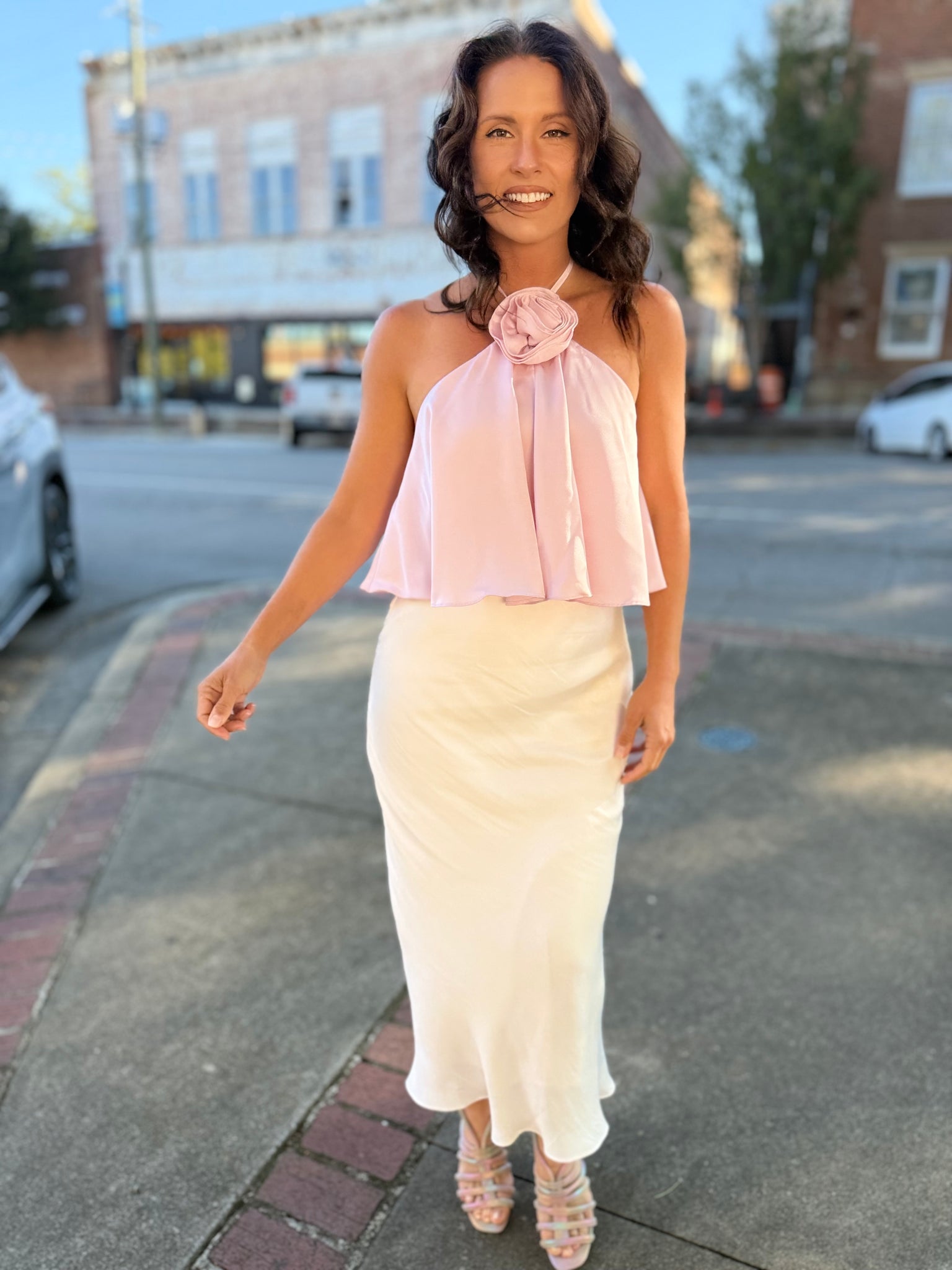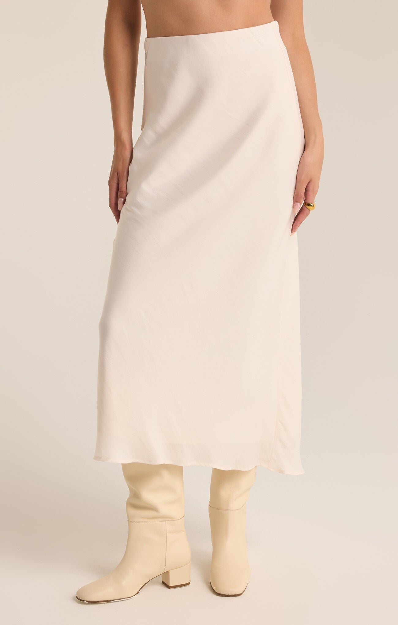 Experience the luxurious feel of this fully lined skirt, designed with a flowy fit and mid-rise, midi length for effortless style. Crafted from our sleek Poly Sheen fabric and cut on the bias, this pull-on elastic waist skirt offers a chic and elevated look, perfect for special occasions.