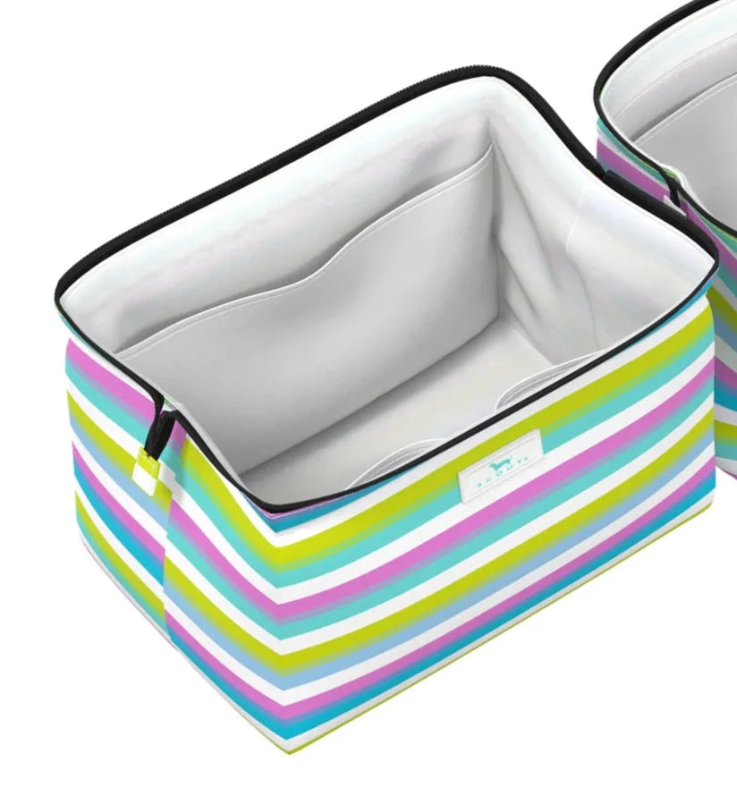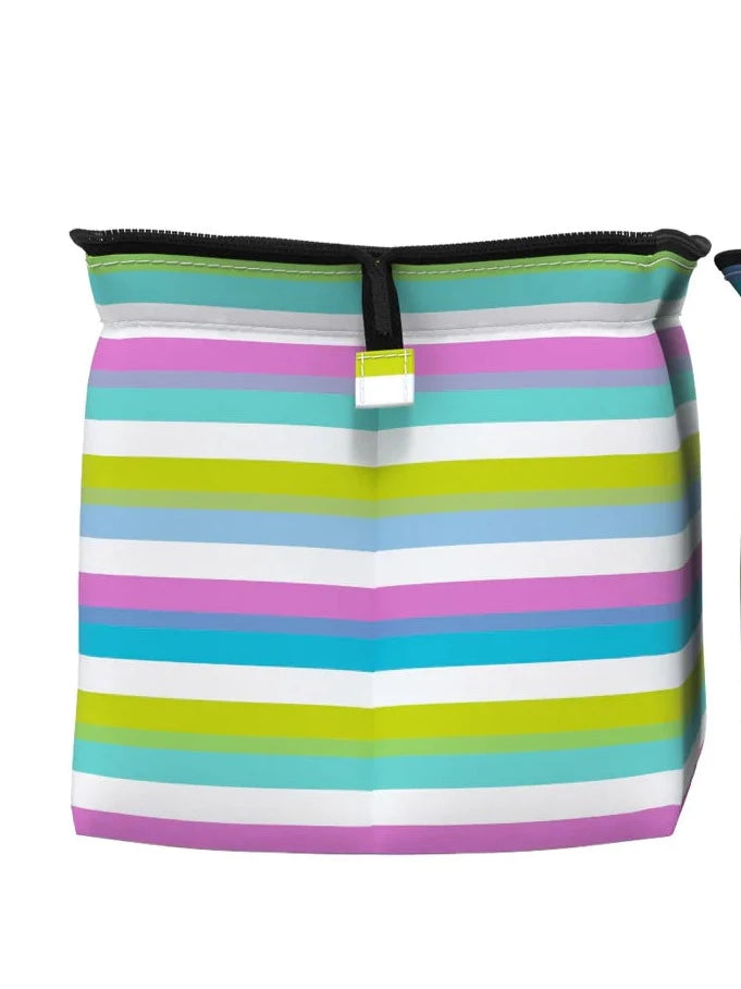 Perfect for travel, at home, or gifting, this makeup bag opens wide for maximum access thanks to a built-in wire frame. It has three slip pockets inside for smaller items, wipe clean, and zip shut. Fits three-ounce bottles upright.