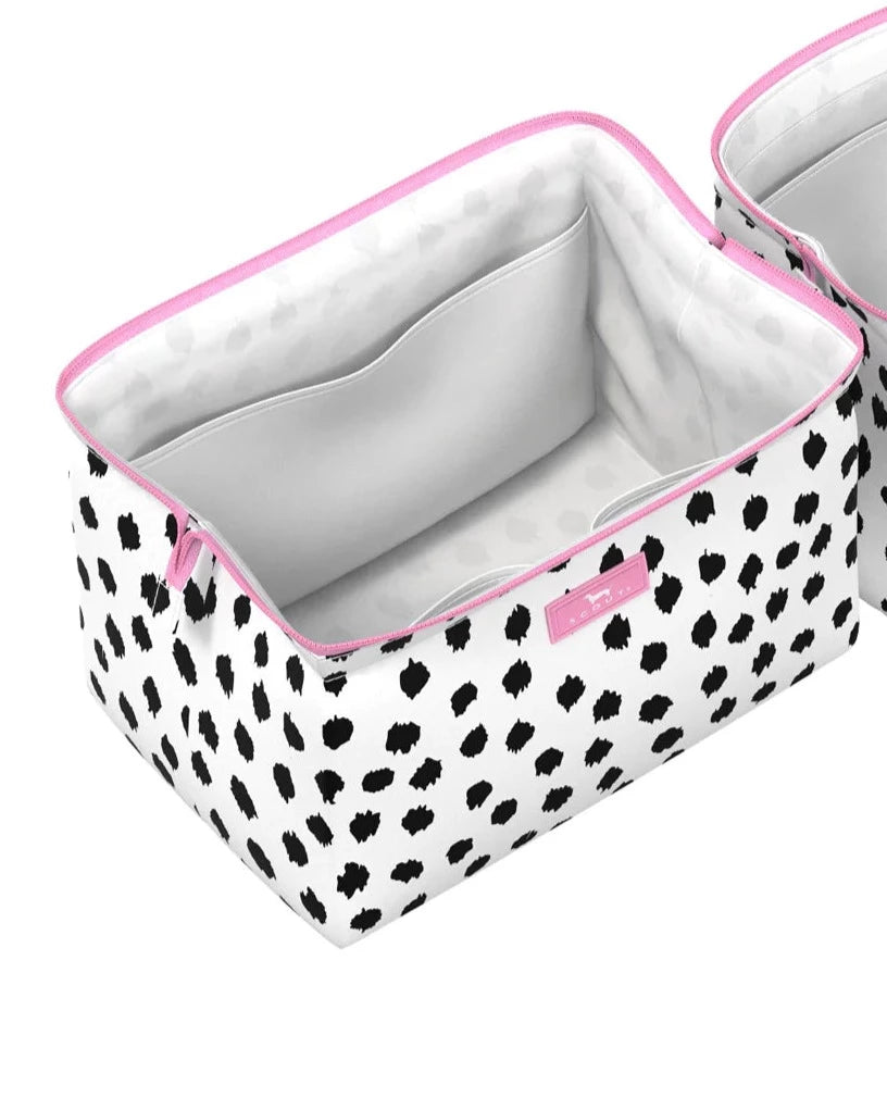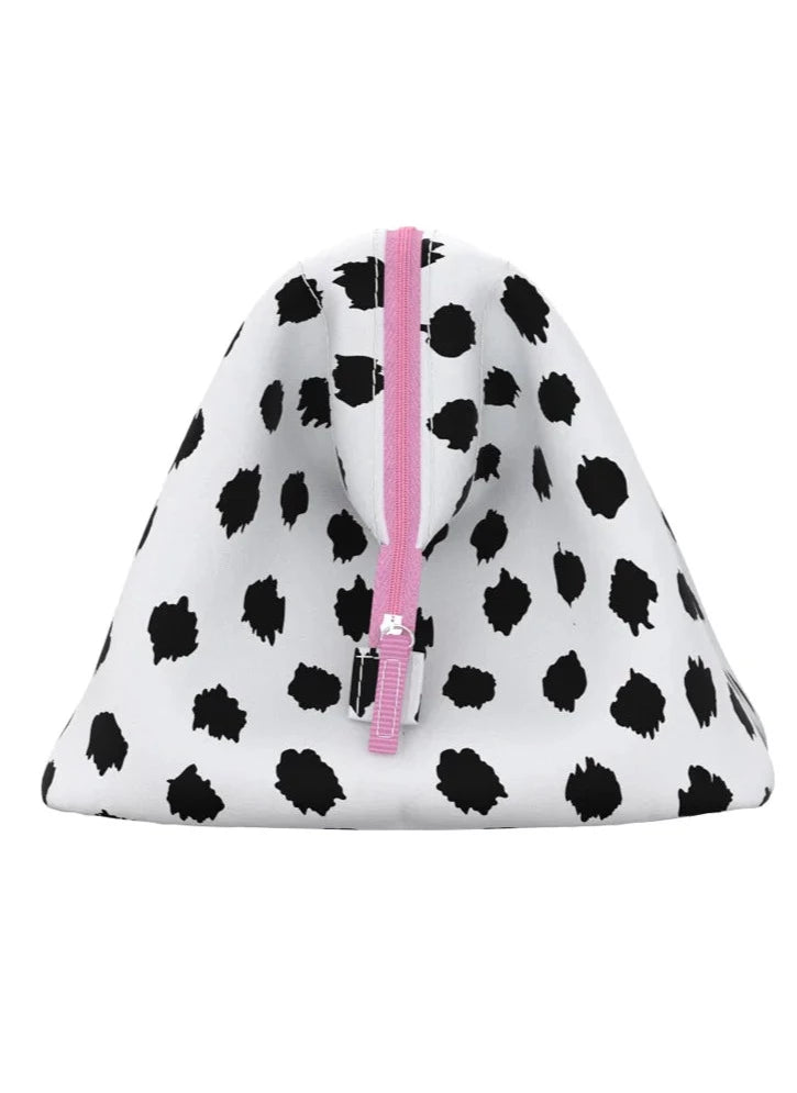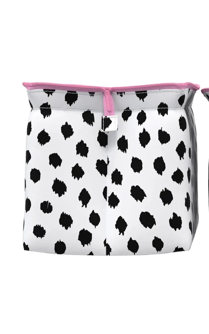 Perfect  for travel, at home, or gifting, this makeup bag opens wide for maximum access thanks to a built-in wire frame. It has three slip pockets inside for smaller items, wipe clean, and zip shut.  Fits three-ounce bottles upright.