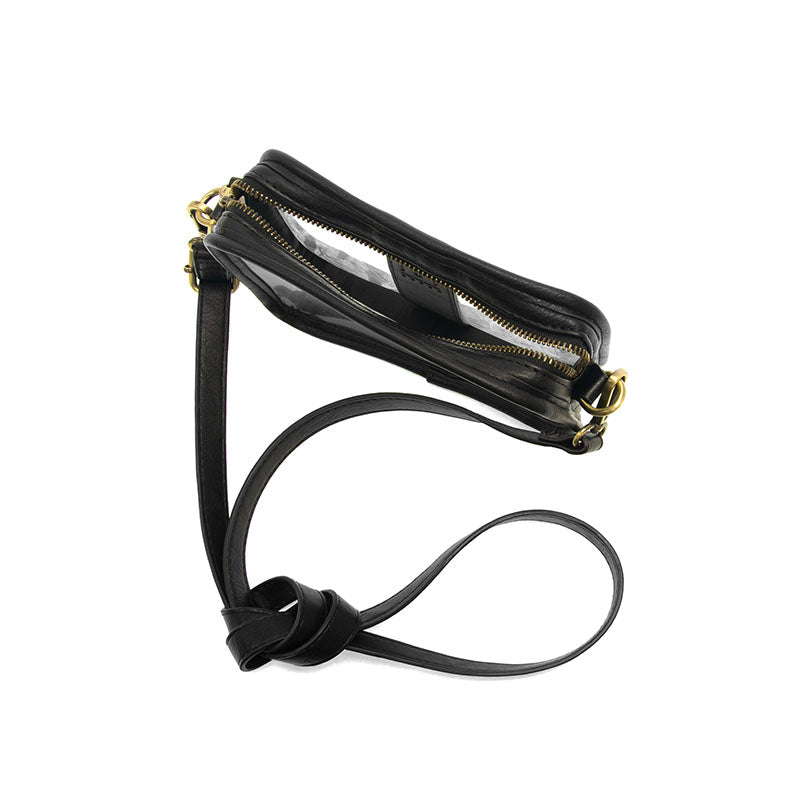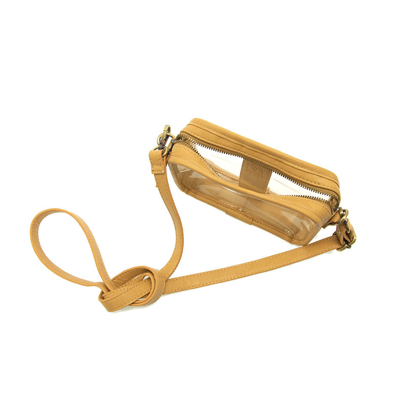 A clear crossbody with style for your next concert or game. Approved for use in most stadiums (we advise double checking your venue) this lightweight, clear bag is perfect for events where you just want to carry the essentials. Just enough room for your phone, small wallet, keys, and lipstick all in a clear package accented with our antiqued vegan leather. The bag zips close securely and is accented with our signature logo zip pull to stow your items safely.
