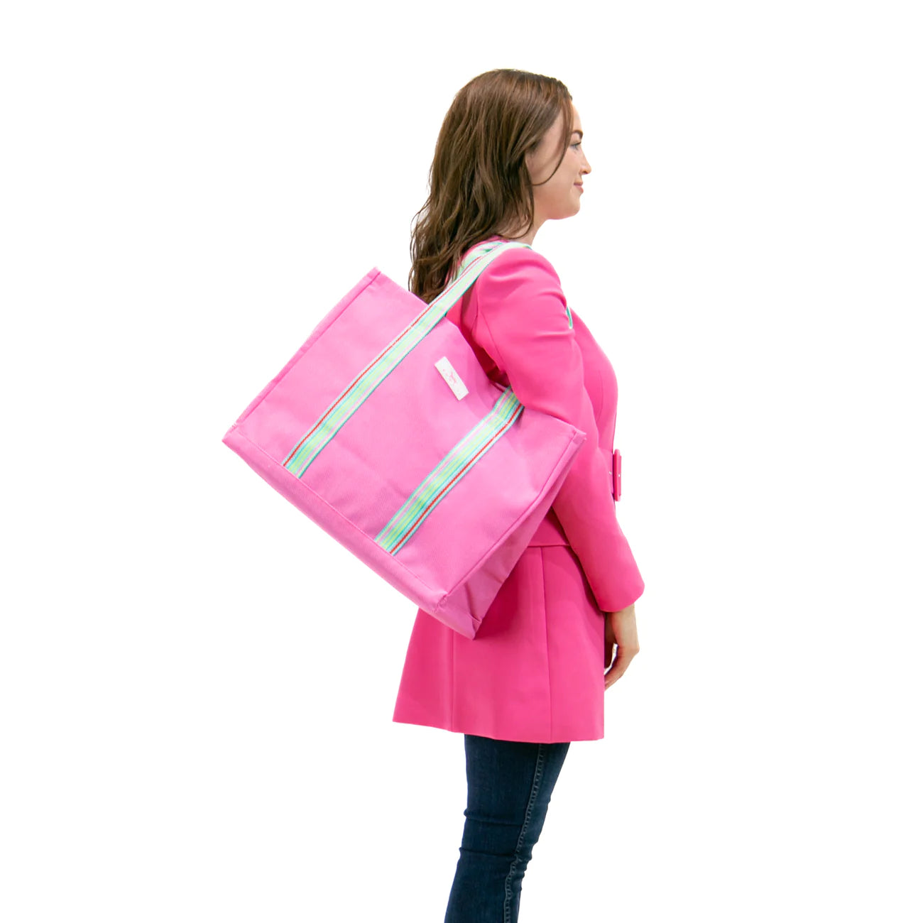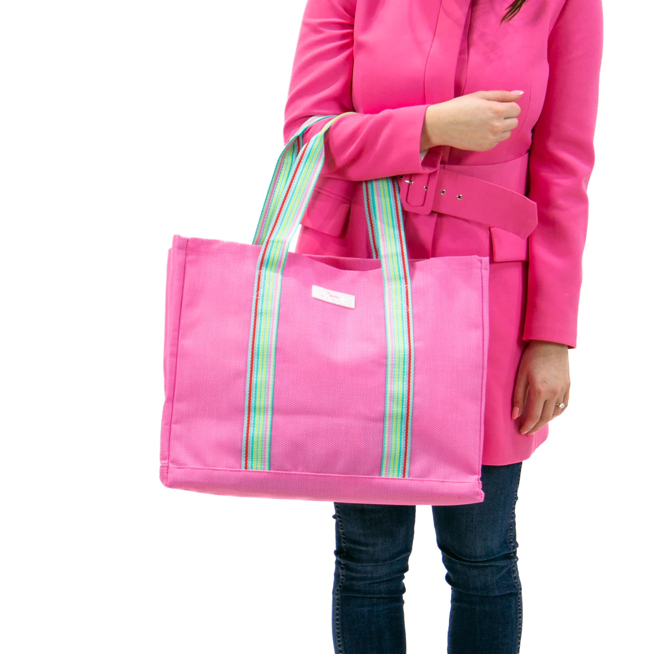 A poly woven version of our Original Deano, this open top tote will be your family’s go-to bag all summer long. Sand and water can easily escape through the breathable, compact basket weave fabric, and the structured bottom keeps this stylishly striped bag upright even when empty for easy loading.
