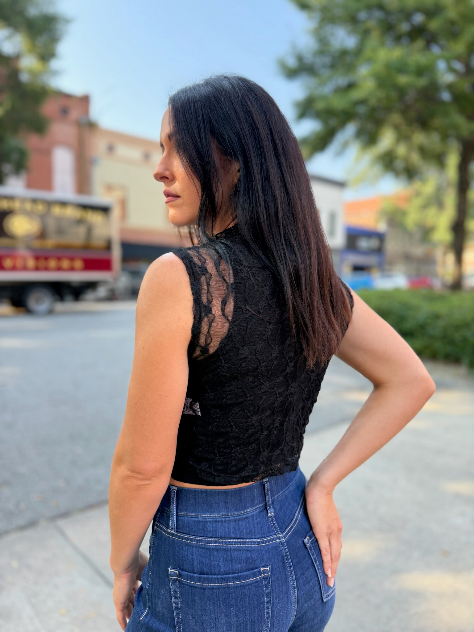 Embrace bold style with this top, featuring a sheer lace top with a distinctive fluted pattern and a high neckline for a touch of elegance. The sleeveless design enhances its sophistication, making it a stunning choice for both daytime engagements and evening outings.