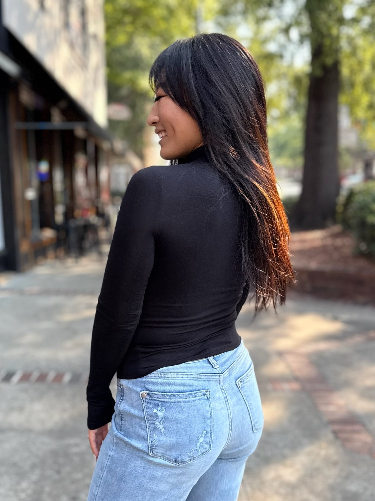 This sleek turtleneck top features a body-hugging fit that enhances the silhouette with a clean, minimal look. Made from a smooth, stretchy knit fabric, it offers a soft handfeel and easy movement without compromising style. Perfect for layering or wearing solo, it pairs effortlessly with high-waisted trousers or skirts for a refined everyday outfit.