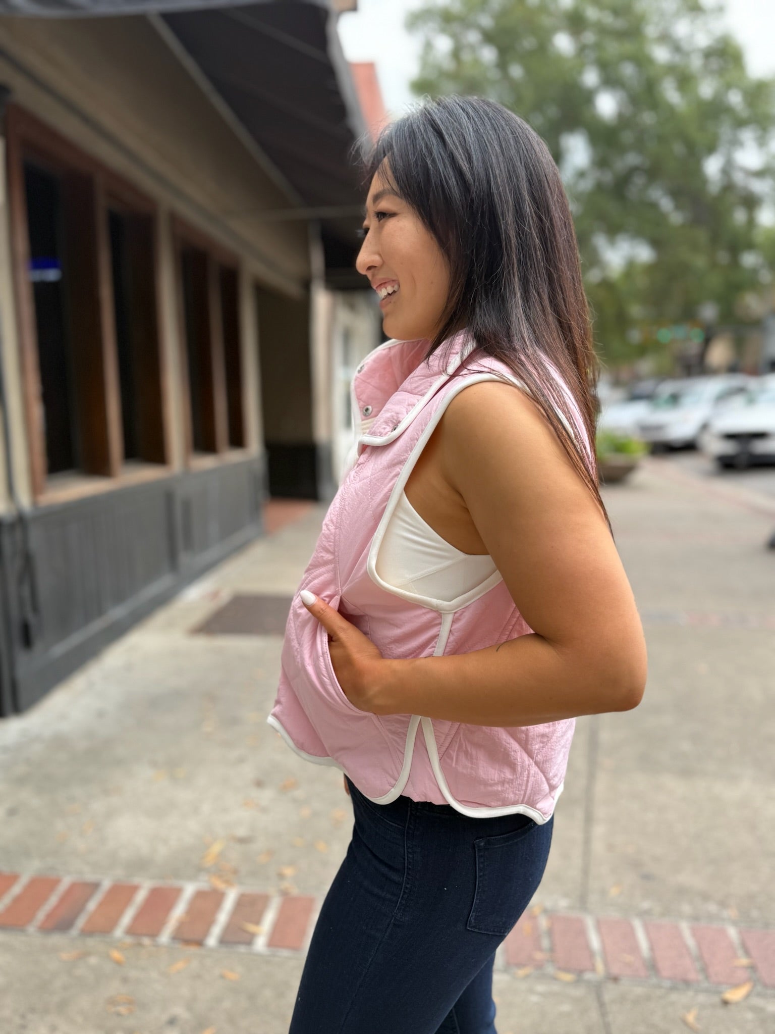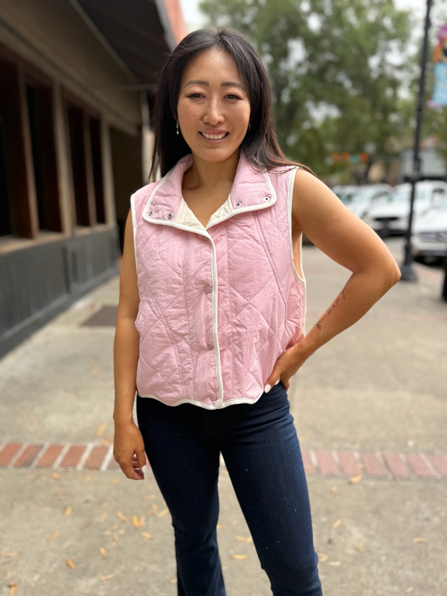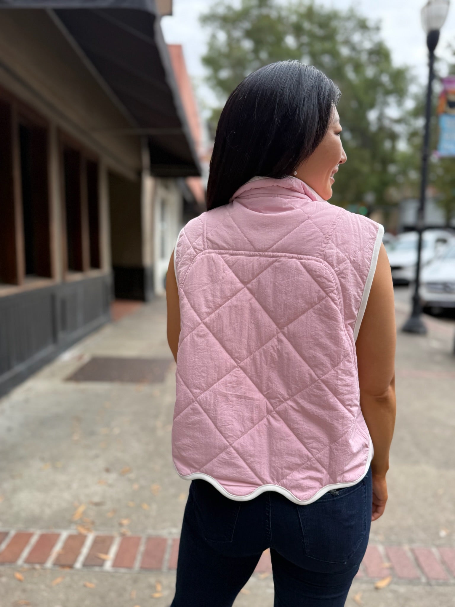 Stay cozy and chic in the Scalloped Hem Quilted Vest. Featuring a stylish scalloped hem and soft quilted texture, this vest adds a feminine touch to your layered looks. Lightweight yet warm, it’s perfect for transitioning seasons—pair it with your favorite knits or blouses for effortless everyday style.