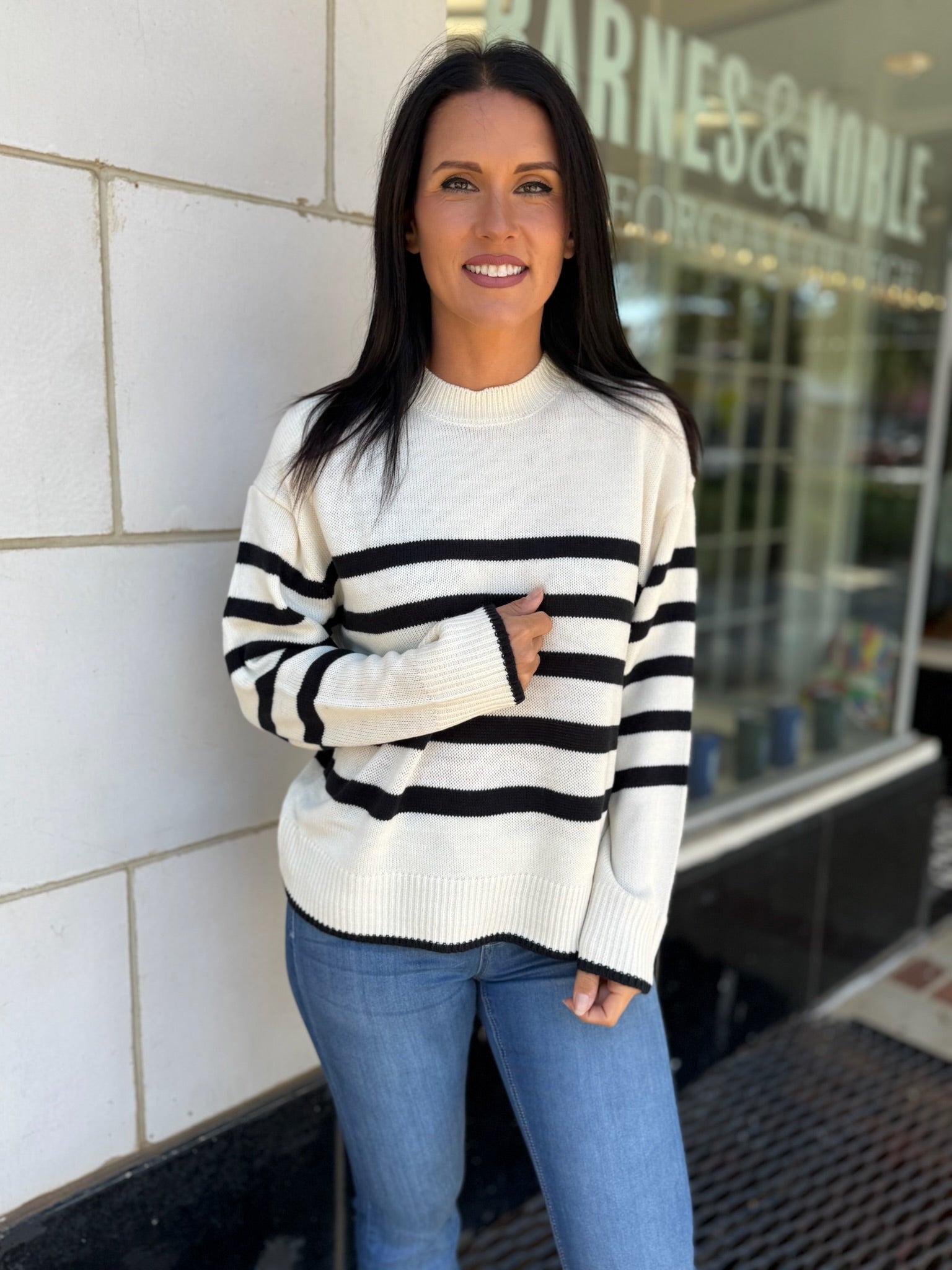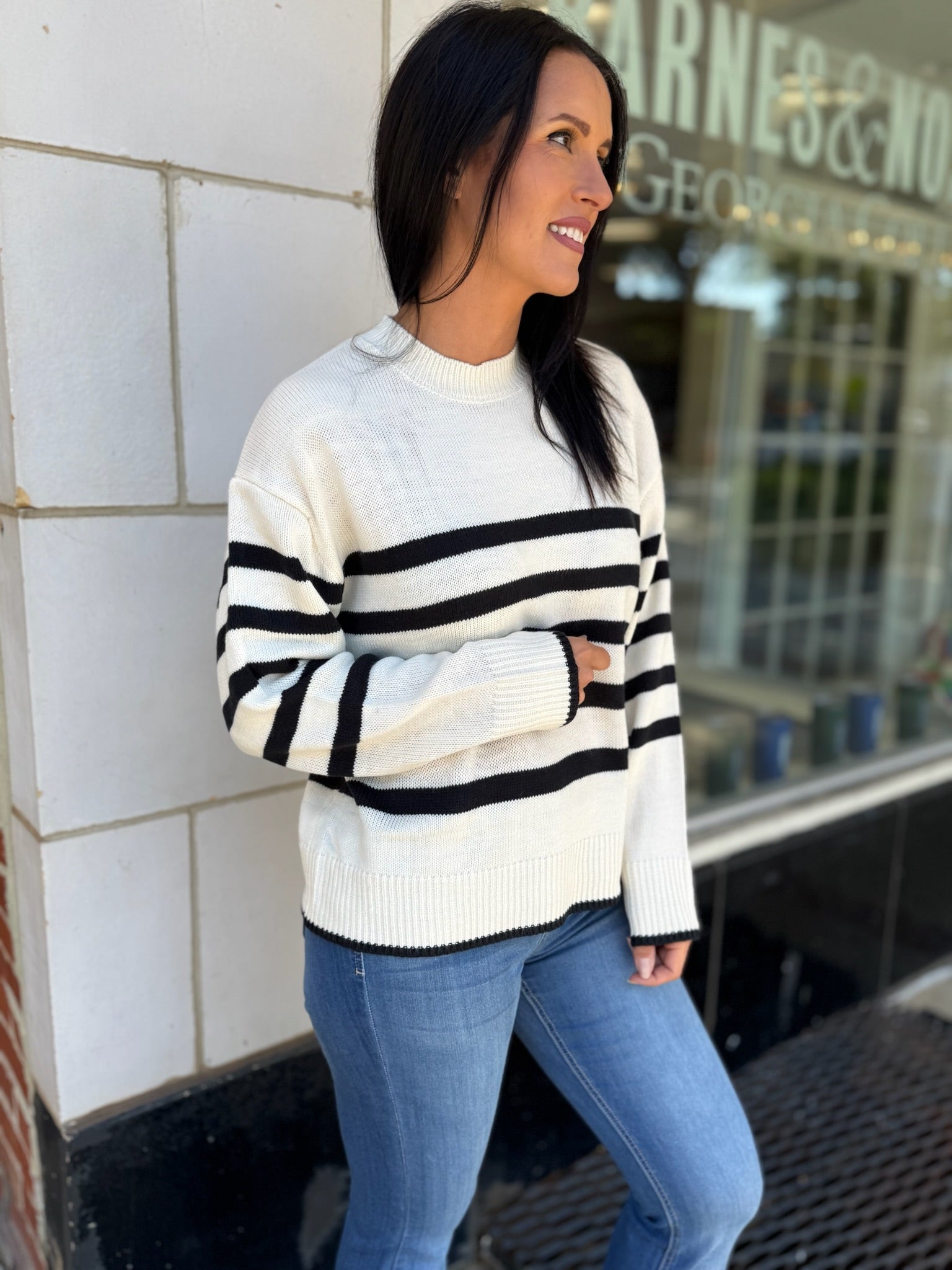 Embrace effortless style with this crew neck sweater featuring a timeless striped pattern. Perfect for transitioning seasons, it offers a relaxed fit that promises comfort and versatility. Pair it with distressed jeans or layer over a collared shirt for a smart-casual look, suitable for a relaxed weekend outing or a casual office day.