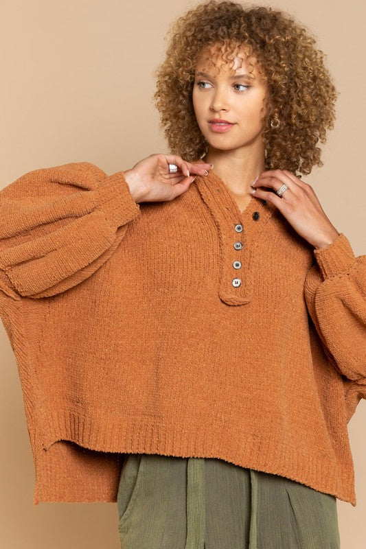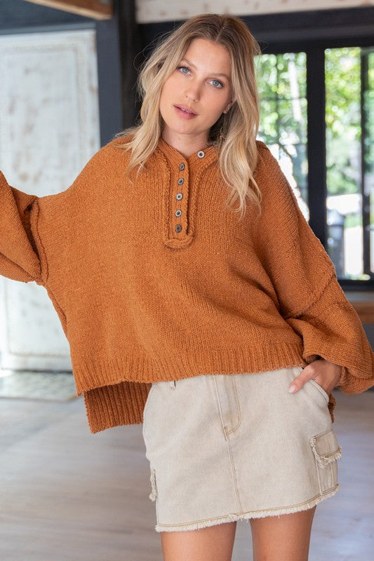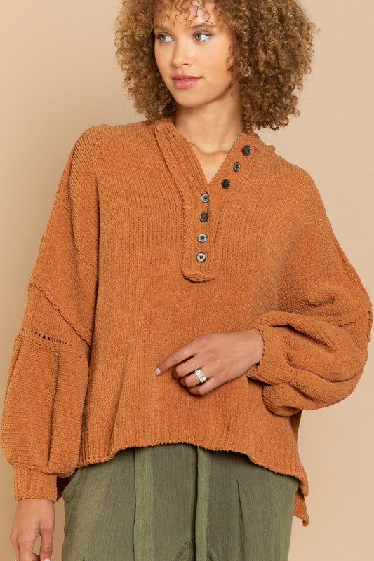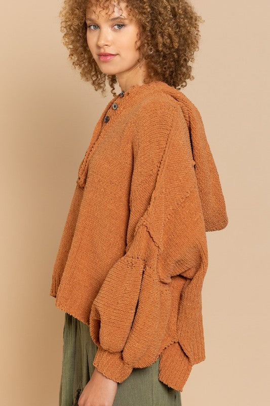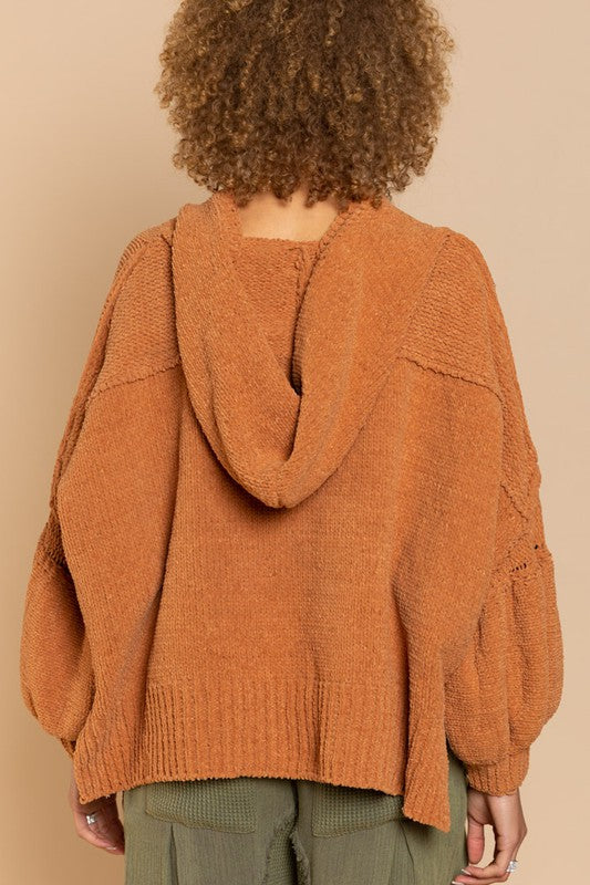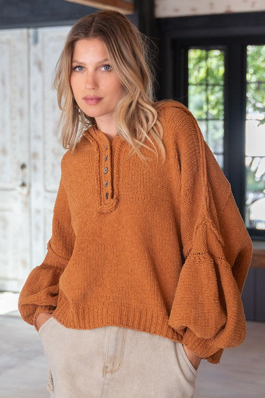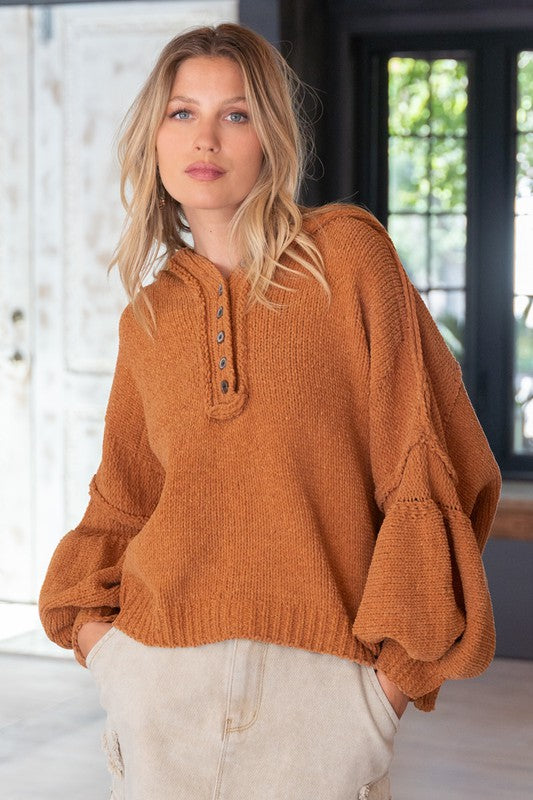 Cinnamon knit sweater with buttons up the front, oversized bubble sleeves and a hood.