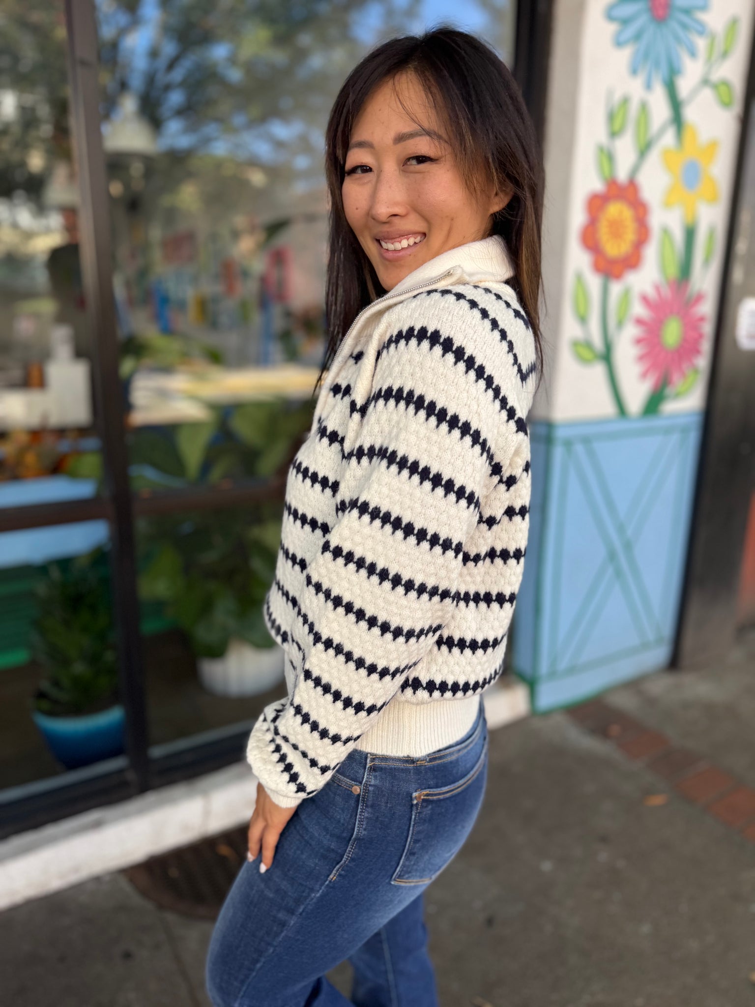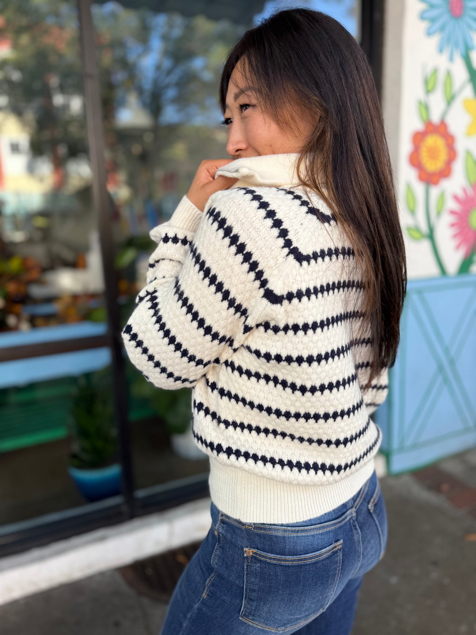 This striped collared sweater combines classic style with cozy comfort. Made from a soft, mid-weight knit, it features a flattering, relaxed fit with bold, contrasting stripes and a polished collar for added structure. Perfect for layering or wearing solo, it’s a versatile choice for both casual and semi-formal looks.