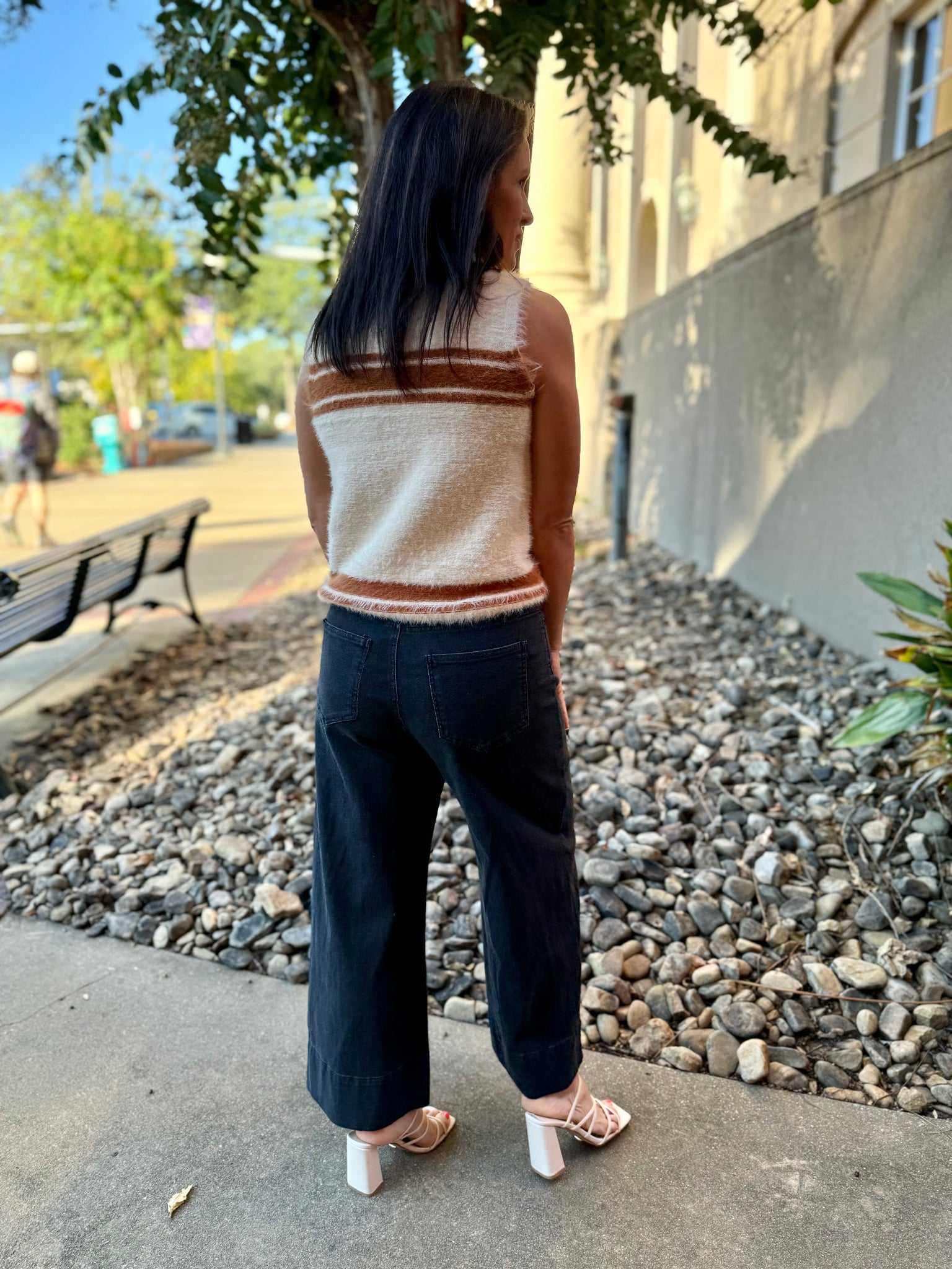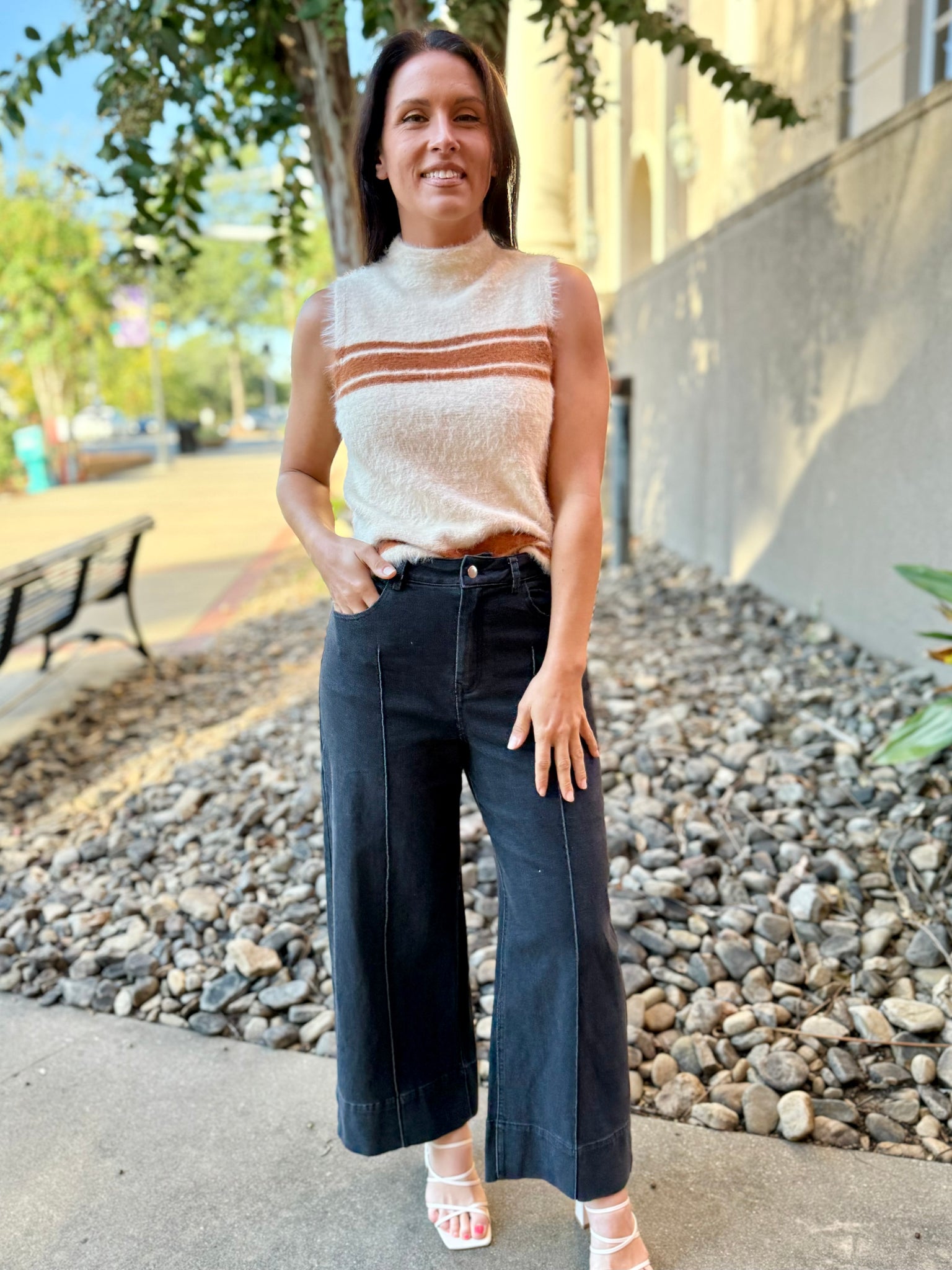 Stay effortlessly chic in this cream mock neck sleeveless sweater vest, featuring classic camel stripe accents for a touch of contrast. Crafted from a soft knit, this versatile piece boasts a cozy mock neck and a relaxed silhouette, perfect for layering or wearing solo. Style it with jeans or trousers for an effortlessly polished look.