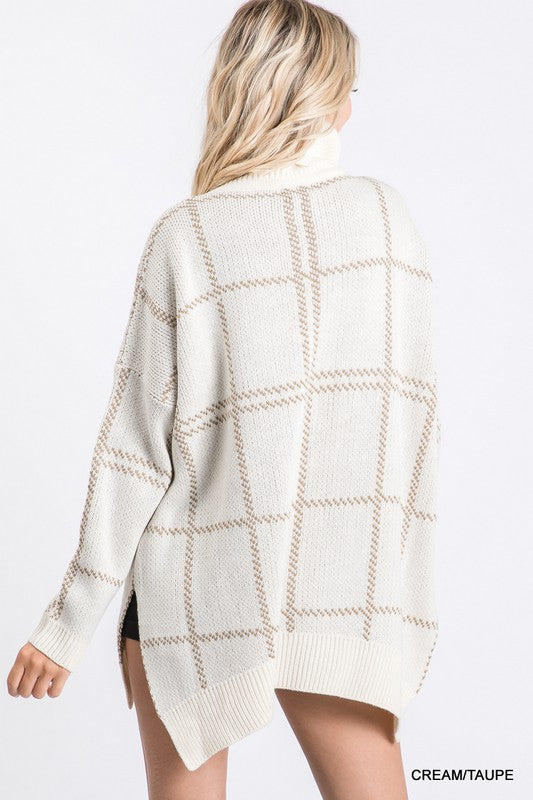 Grid print pullover with a turtle neckline, long sleeves, and a vented hemline.