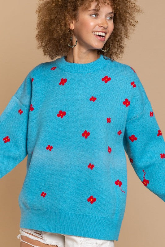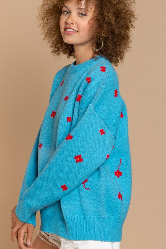 Designed in round neckline, oversized fit, long sleeve, clean edge, drop shoulder, flower knitting. featured in acrylic sweater.