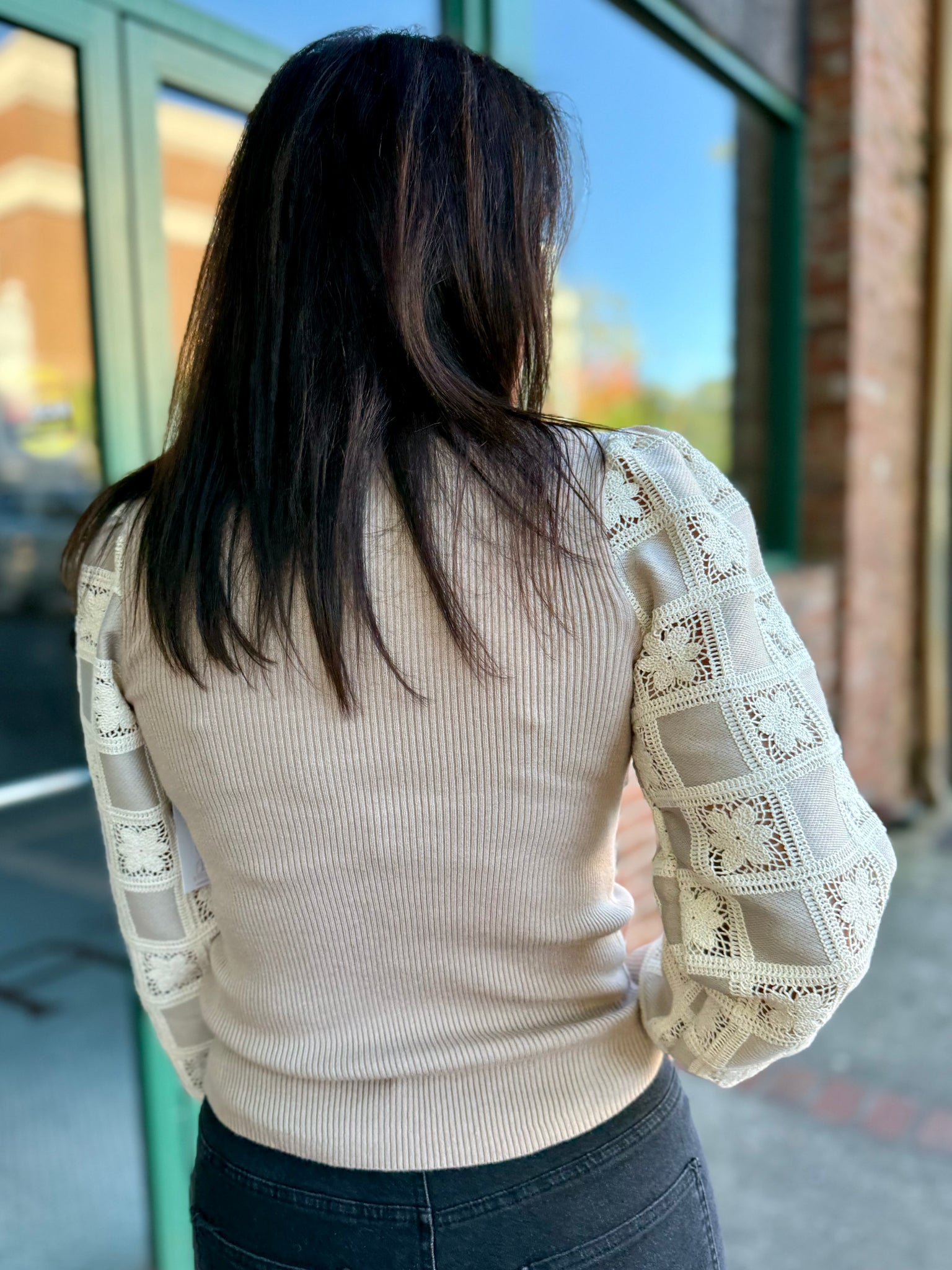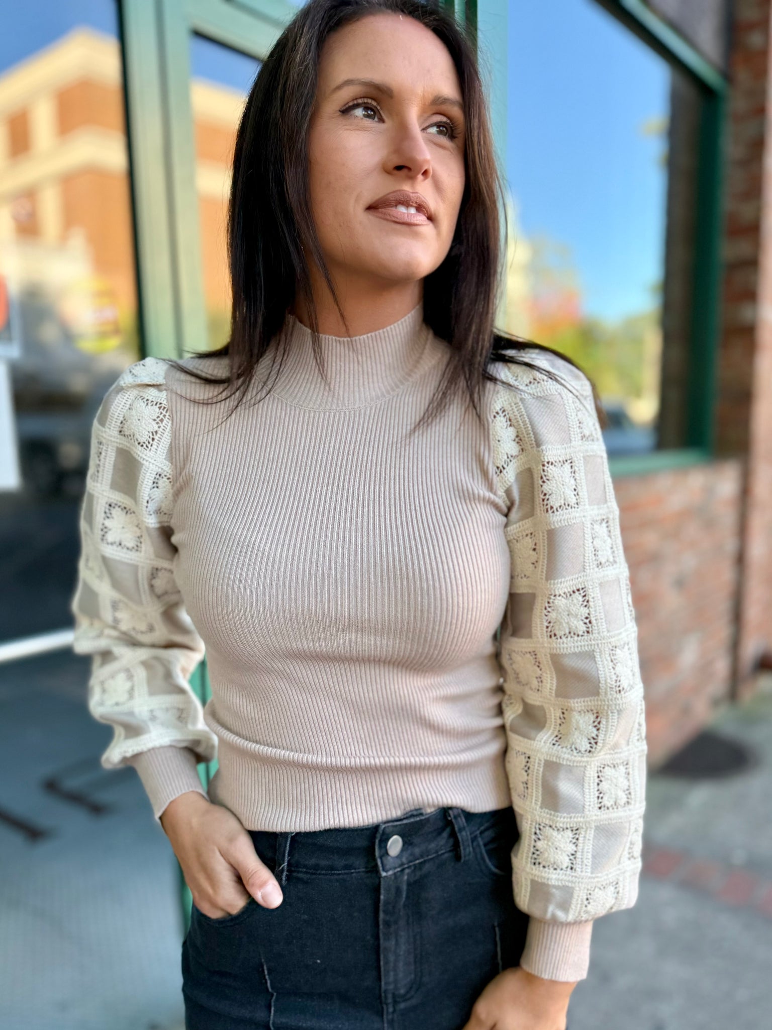 Stay cozy and chic in our Solid Mock Neck Sweater Knit Pullover, featuring elegant crochet floral overlay sleeves. This midweight top is the perfect blend of style and comfort, adding a touch of sophistication to your fall wardrobe!