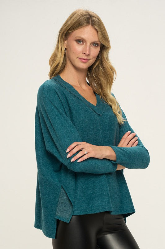 V Neck Top Long Sleeves Split Hems Top Solid Knit Top Brushed Knit Top Wool Brush Knit Top Fuzzy Knit Top Soft Knit Top Casual Top Basic Top Everyday Wear Top Easy To Wear Top Fashion Top