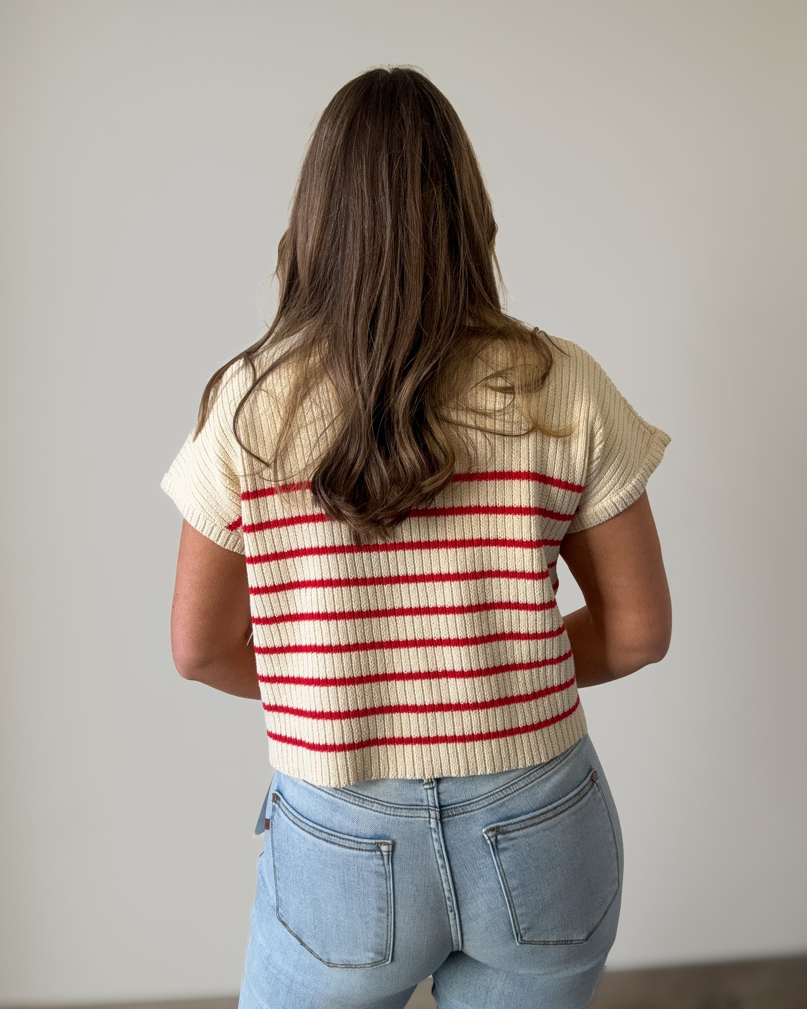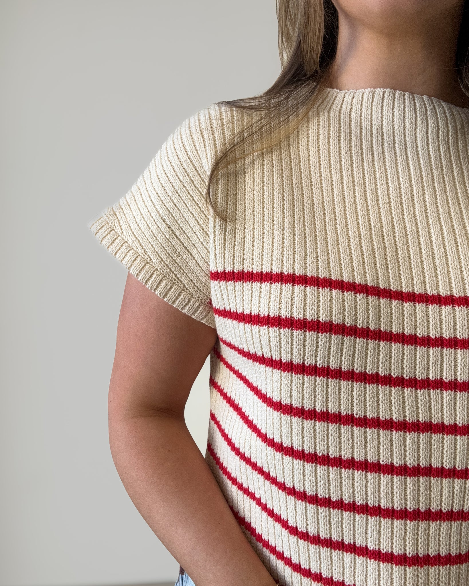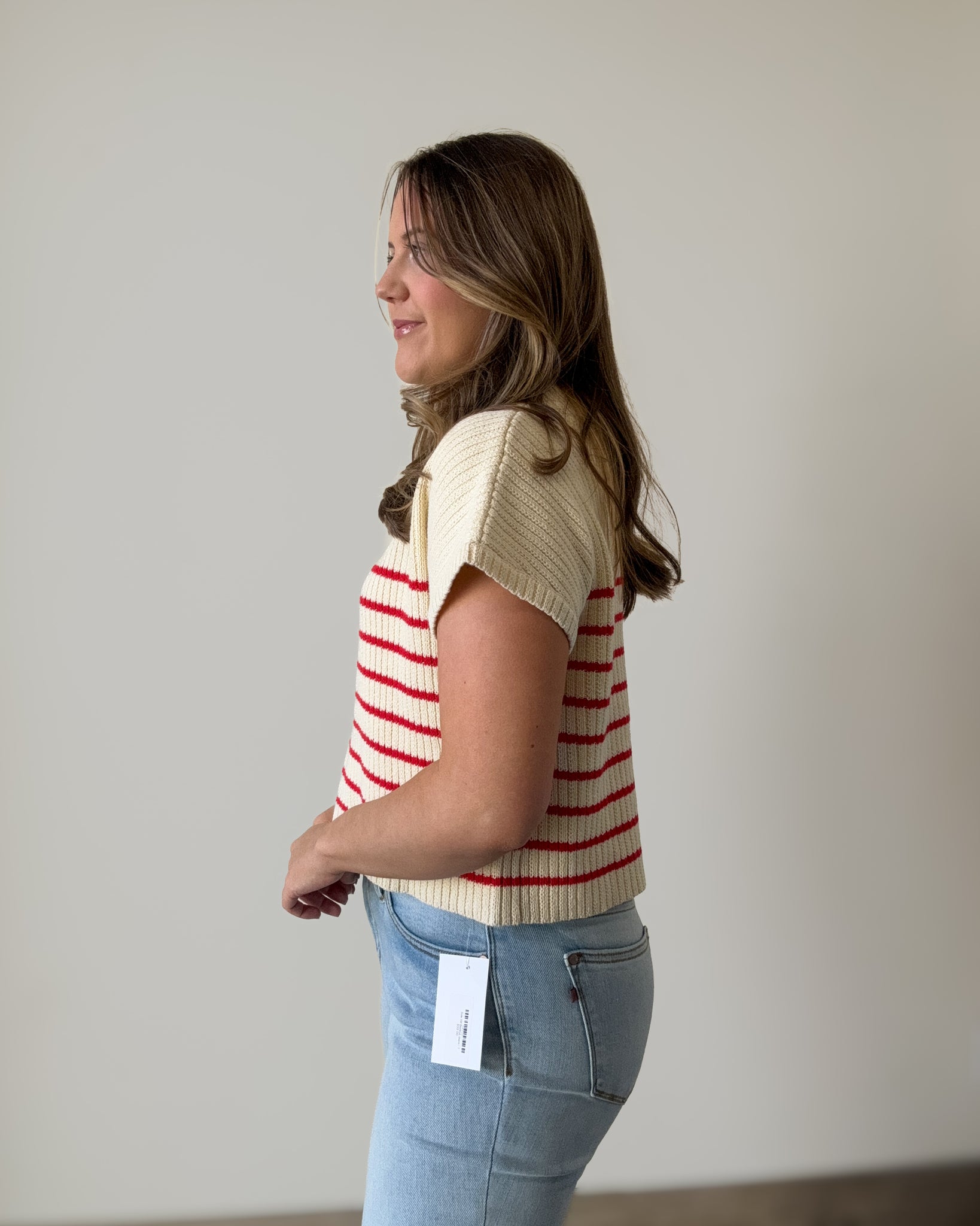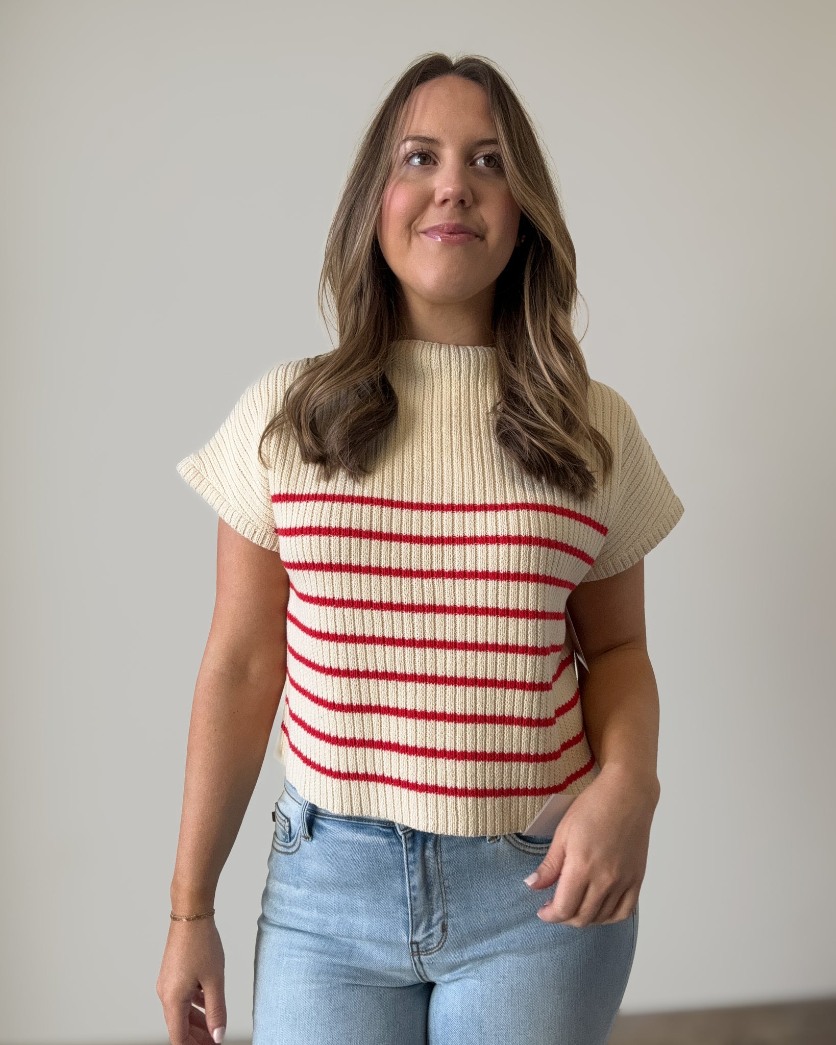 Knitted mock neck sleeveless top featuring stripe pattern. Unlined. Knit. Non-sheer. Lightweight.
