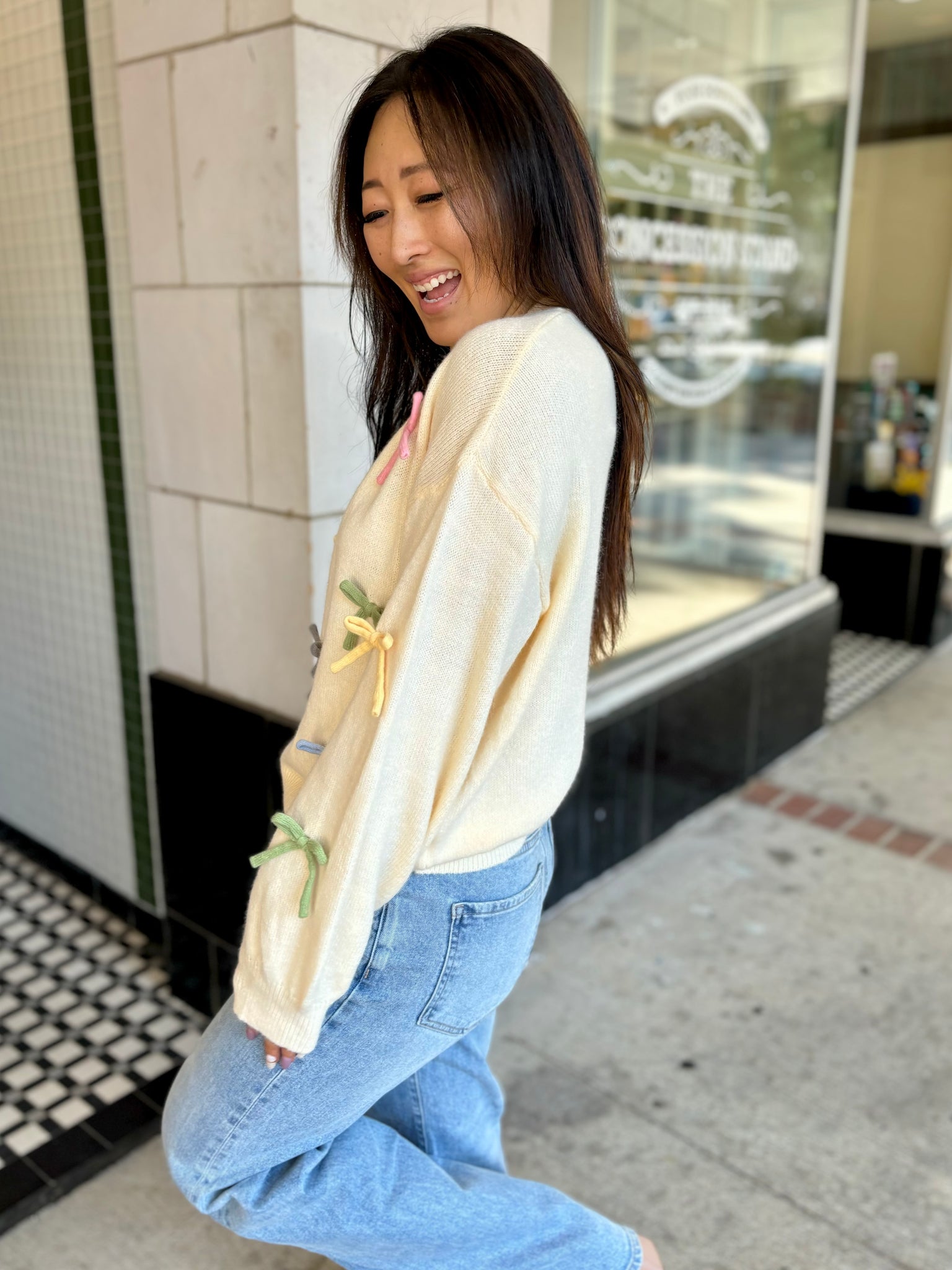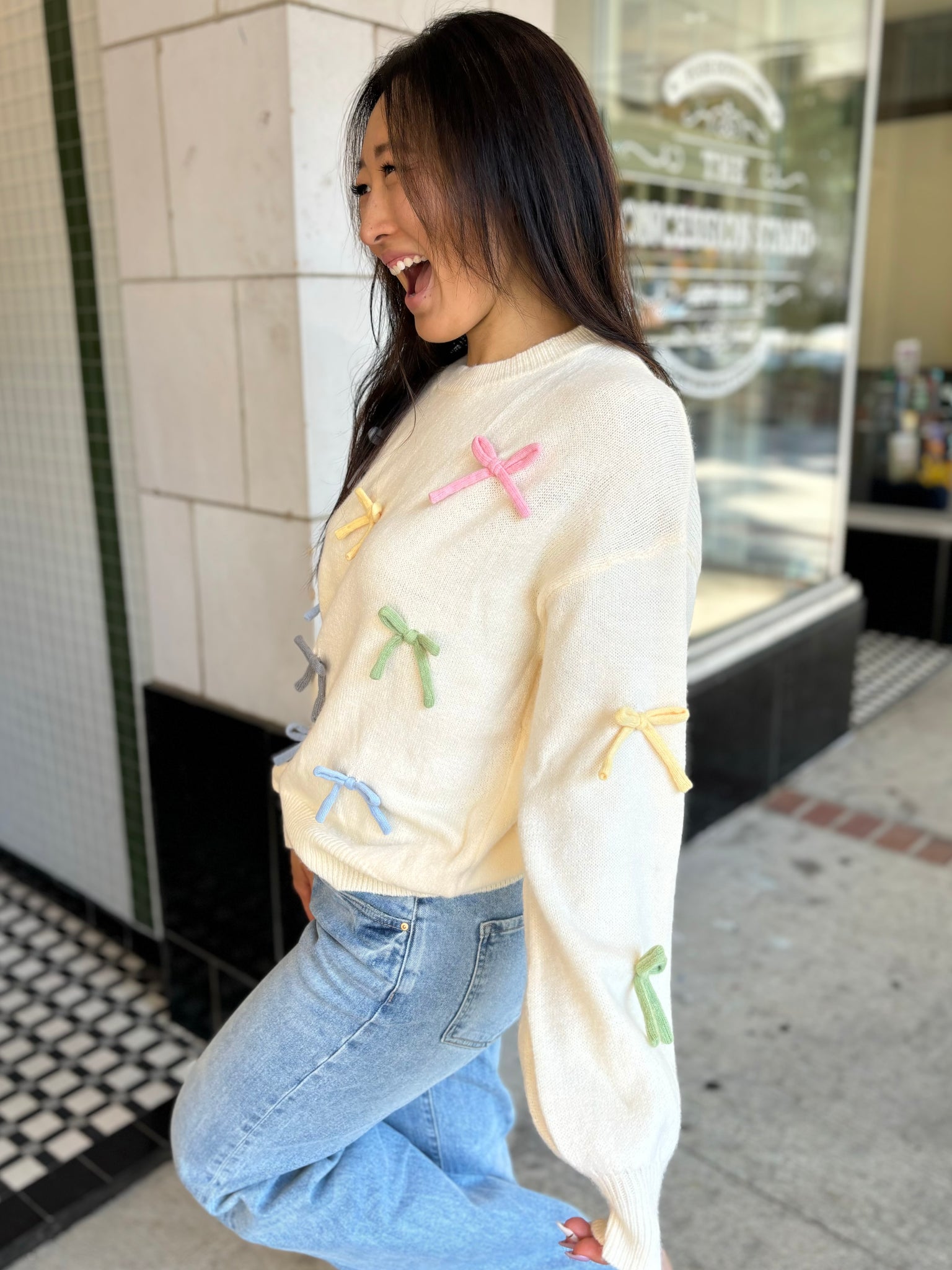 Solid multicolor 3D ribbon applique long sleeve knit sweater. Unlined. Knit. Non-sheer. Lightweight.