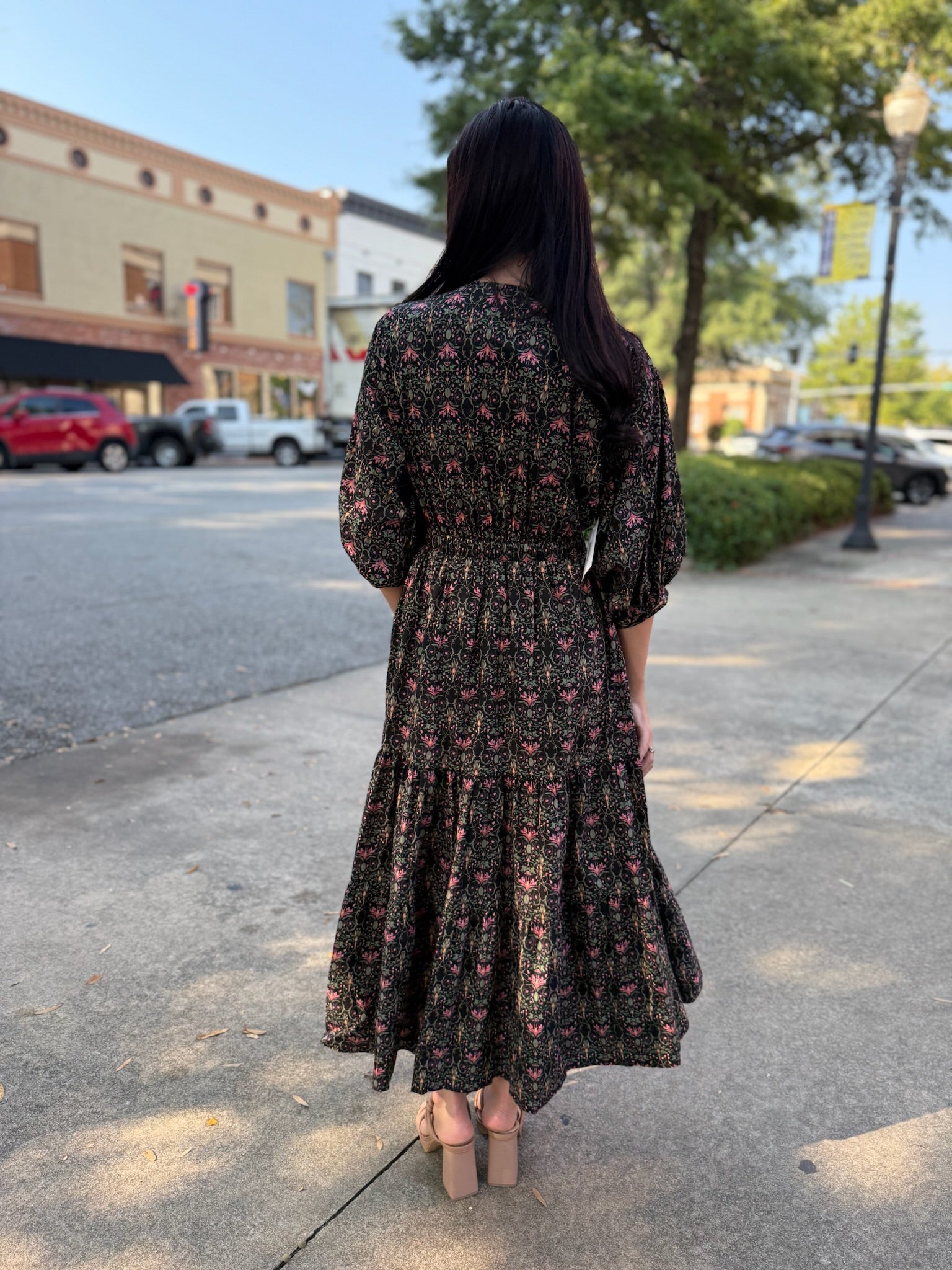 This floral wonder brings all the charm with its romantic puff sleeves, flattering v-neckline, and subtle cutout detail that adds just the right touch of intrigue. The dark, moody floral print pops with rich jewel tones, making it perfect for both daytime strolls and evening outings.