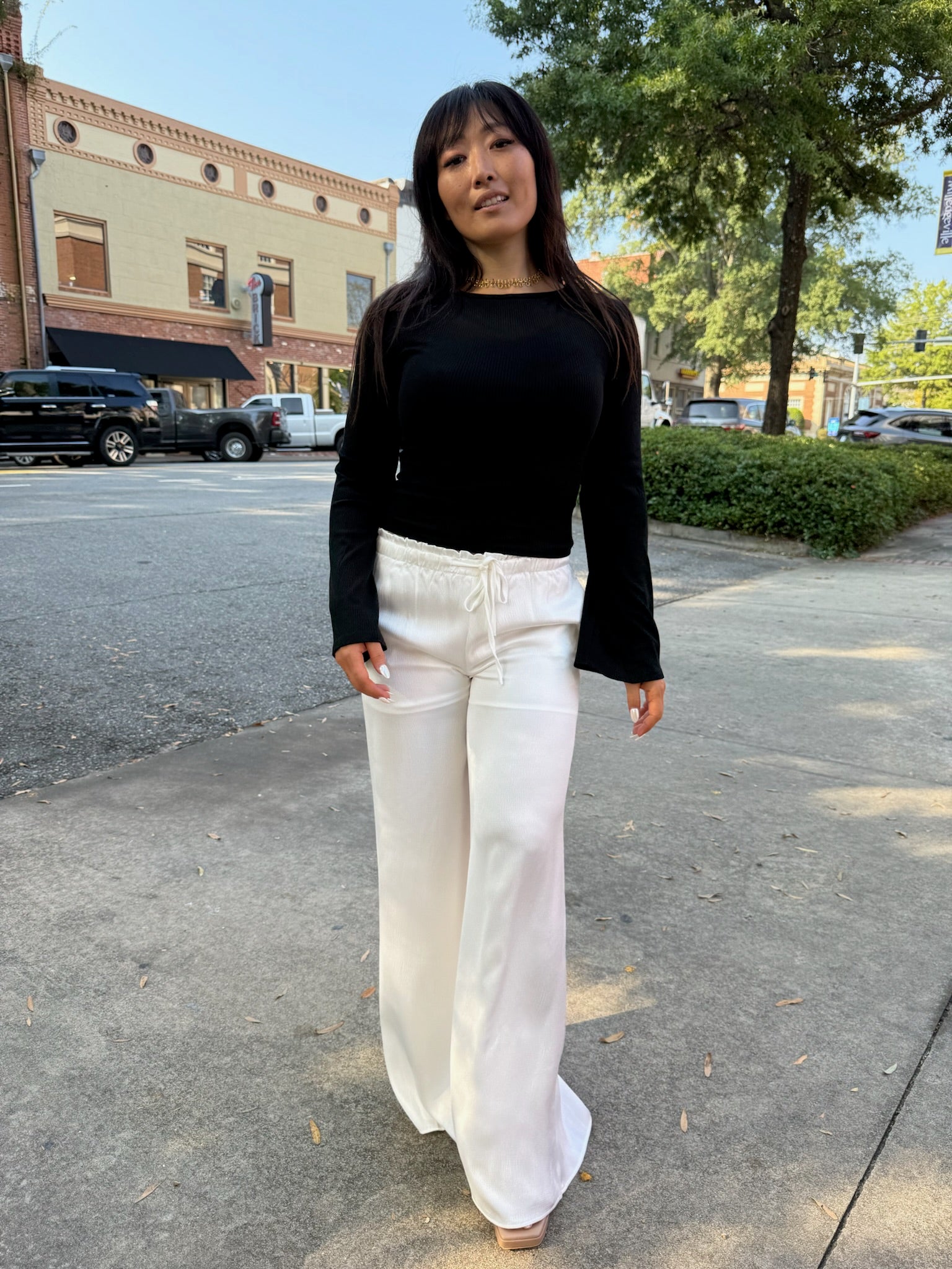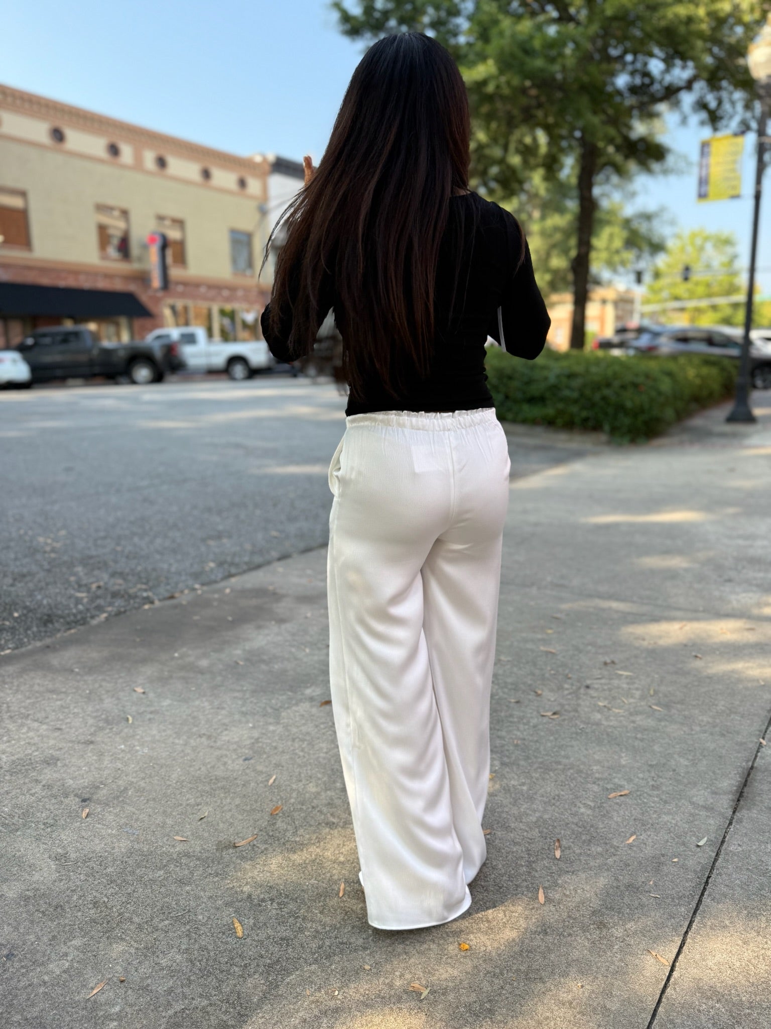 Elevate your everyday with the Cloudwalk Satin Trousers. Designed for the dreamers and the effortlessly chic, these wide-leg white satin pants blend comfort with elevated simplicity. Featuring a flattering high-rise, elastic waistband with drawstring, and a subtle sheen that catches the light just right, they glide as you move—making every step feel like a soft breeze. Perfect for beach escapes, rooftop evenings, or styled down with a casual tee, these trousers redefine laid-back luxury.