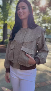Taupe/Brown Perforated Pattern Ruffle Detail Bomber Jacket