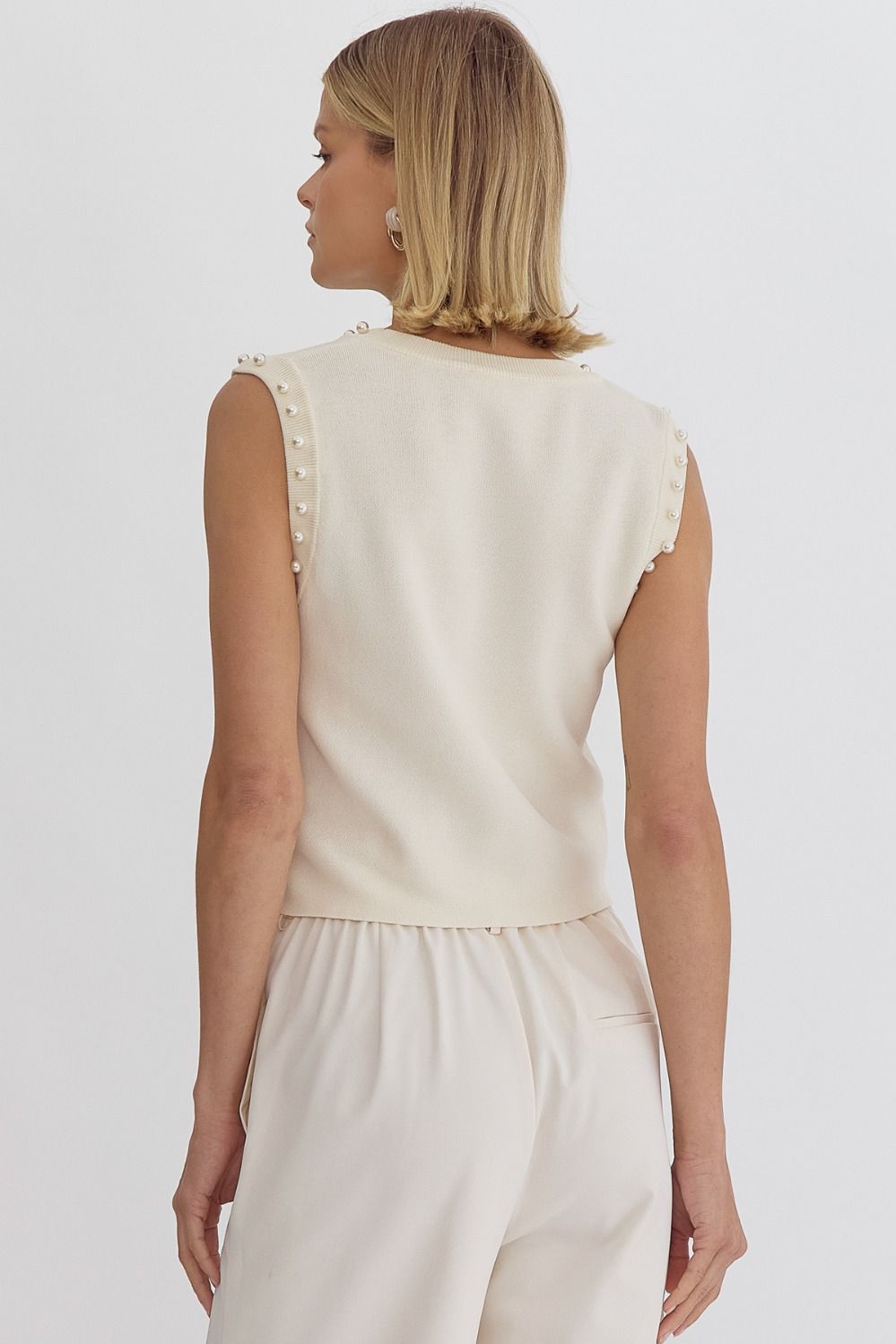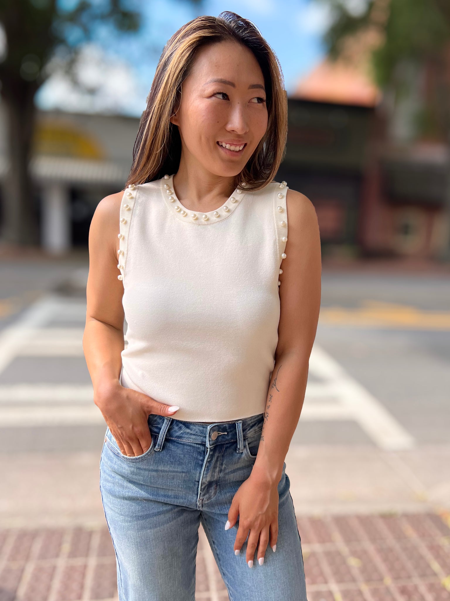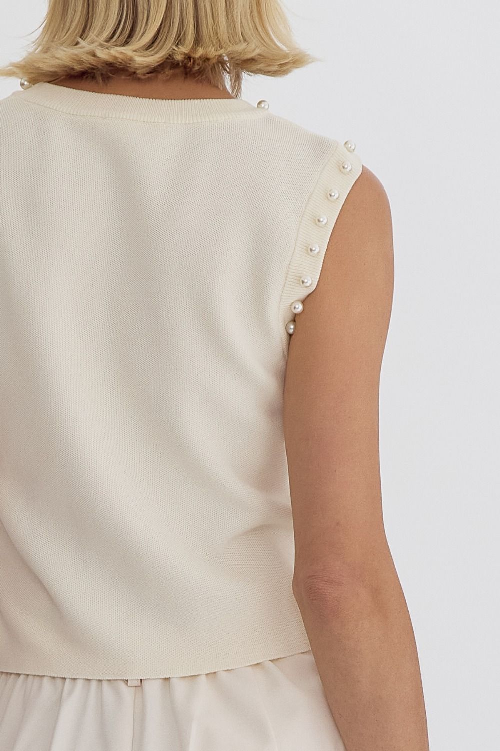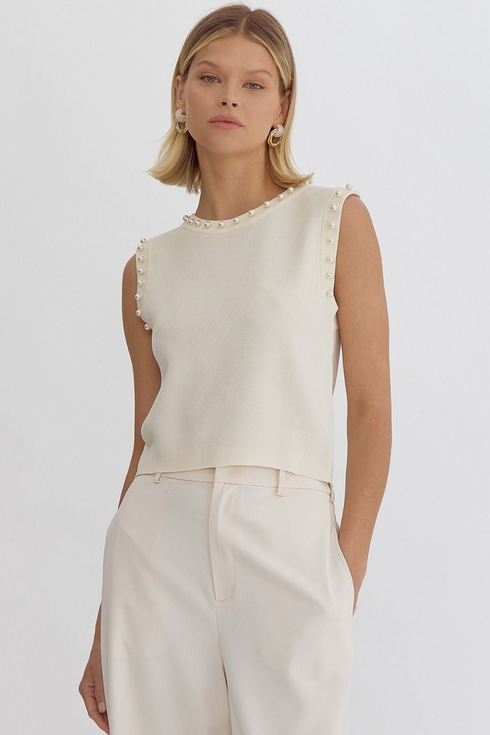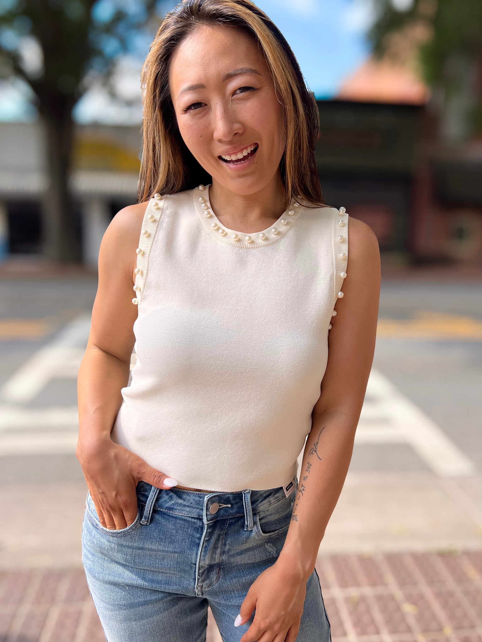 Elevate your outfit with our Dress It Up Top! This solid cream, round neck, sleeveless cropped top adds a classy touch to any look. The pearl detail on the hem adds a touch of elegance. Made with lightweight knit material, it's perfect for work or any occasion.