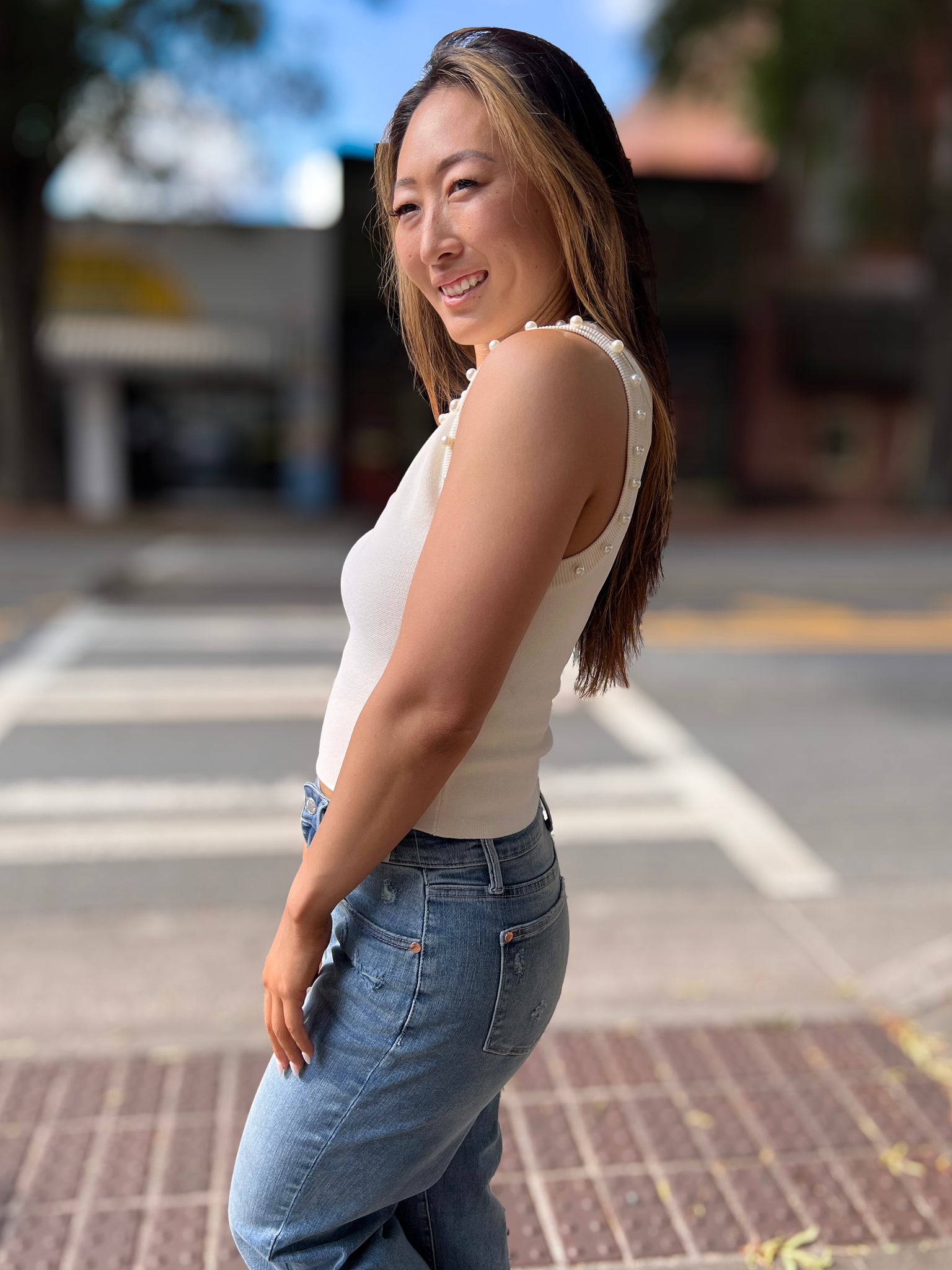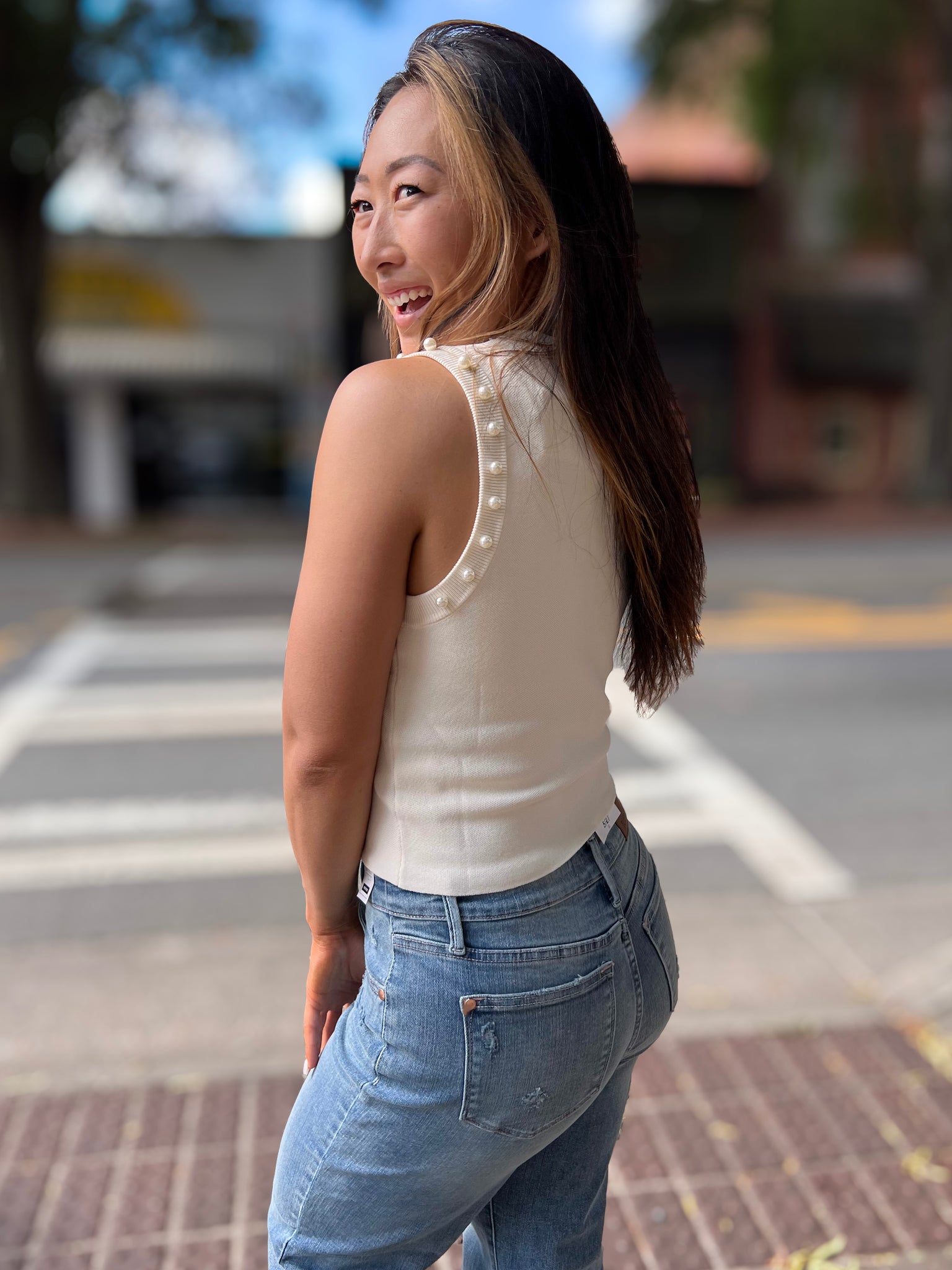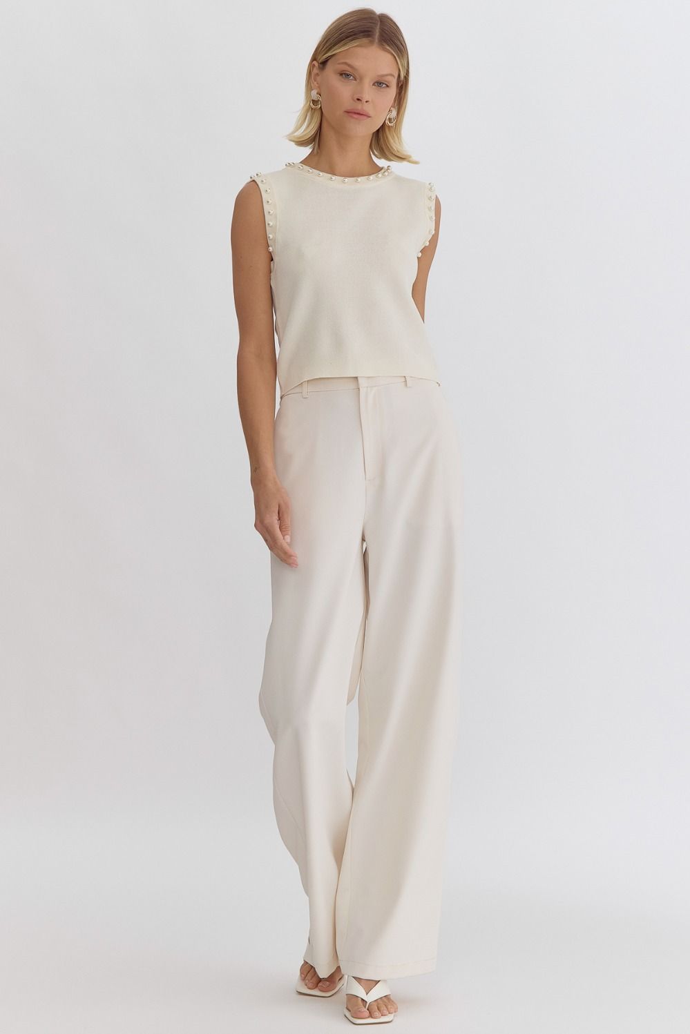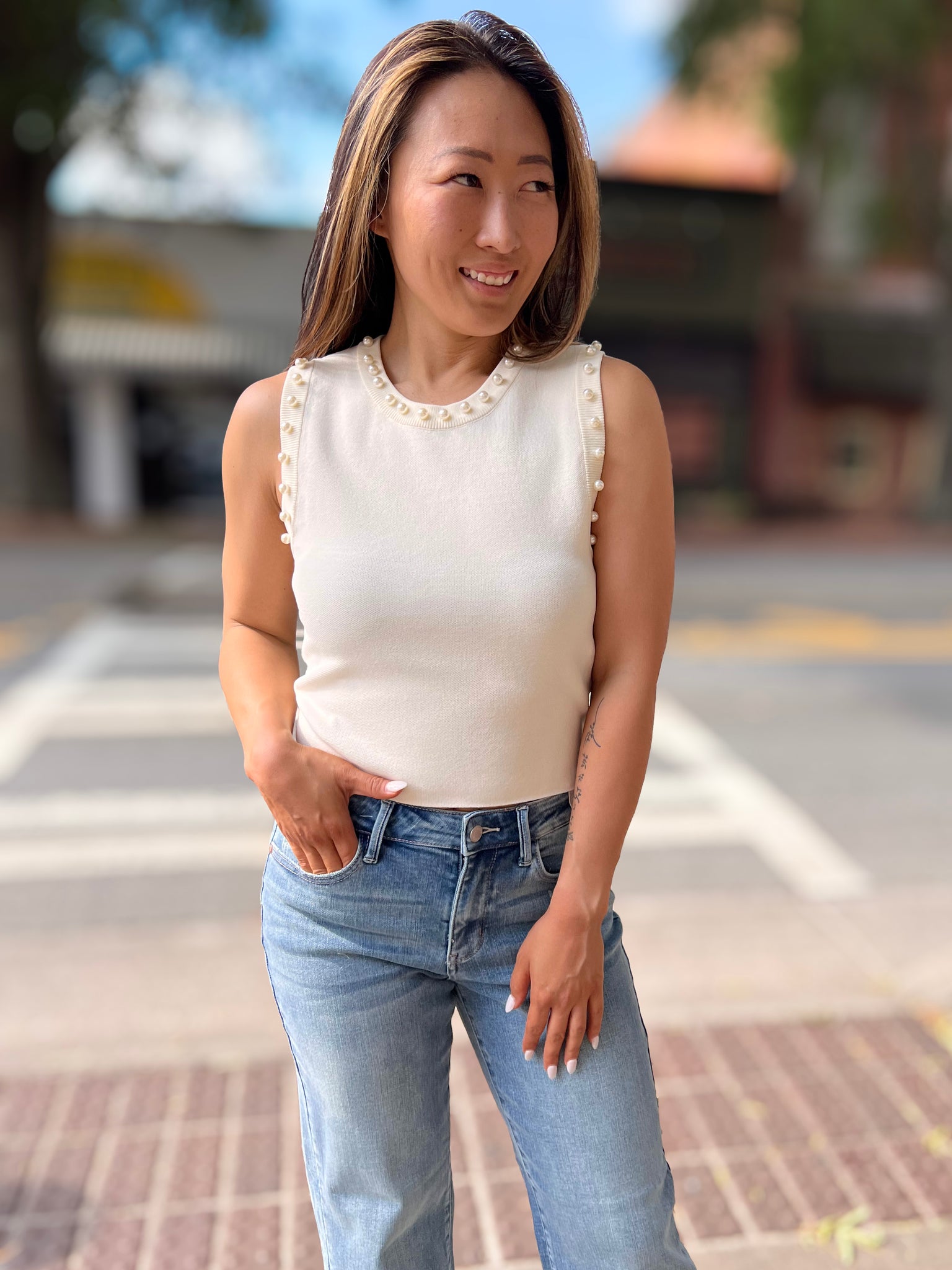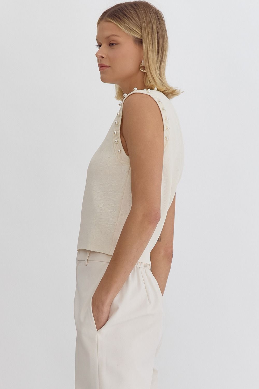 Elevate your outfit with our Dress It Up Top! This solid cream, round neck, sleeveless cropped top adds a classy touch to any look. The pearl detail on the hem adds a touch of elegance. Made with lightweight knit material, it's perfect for work or any occasion.