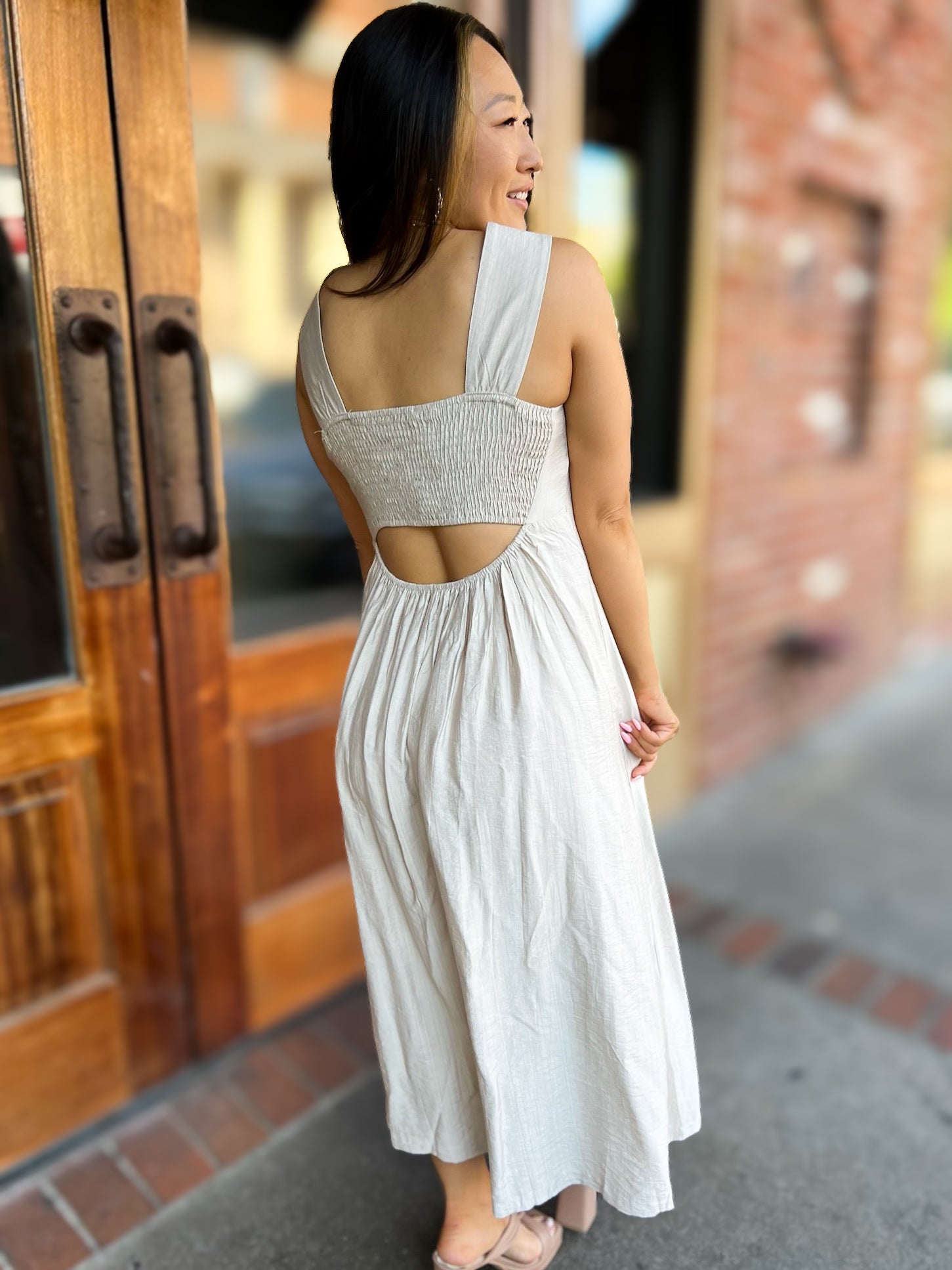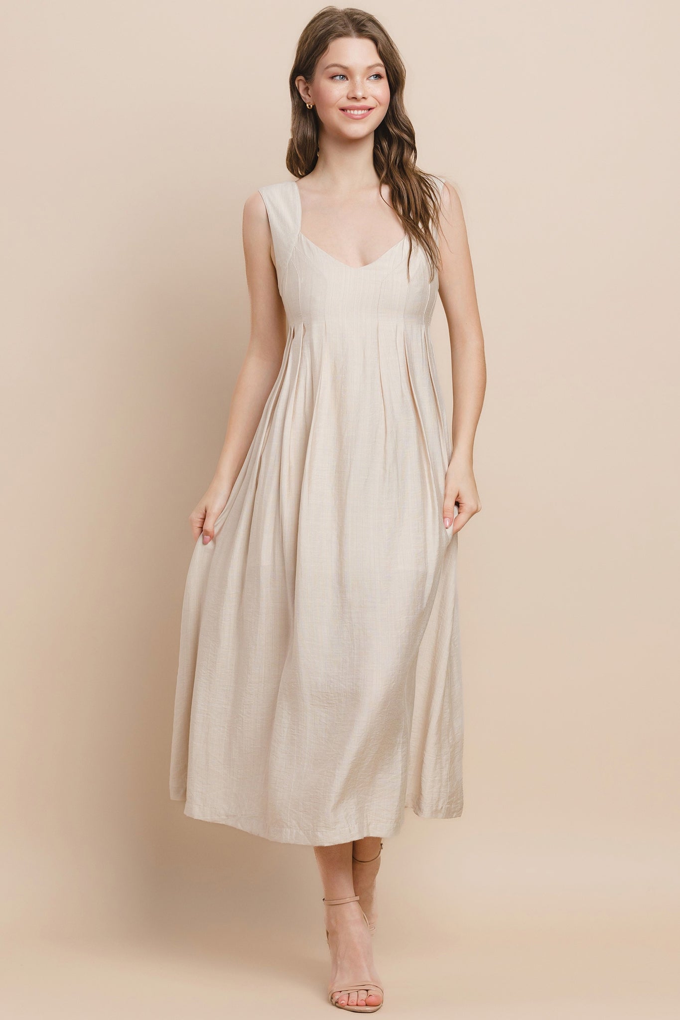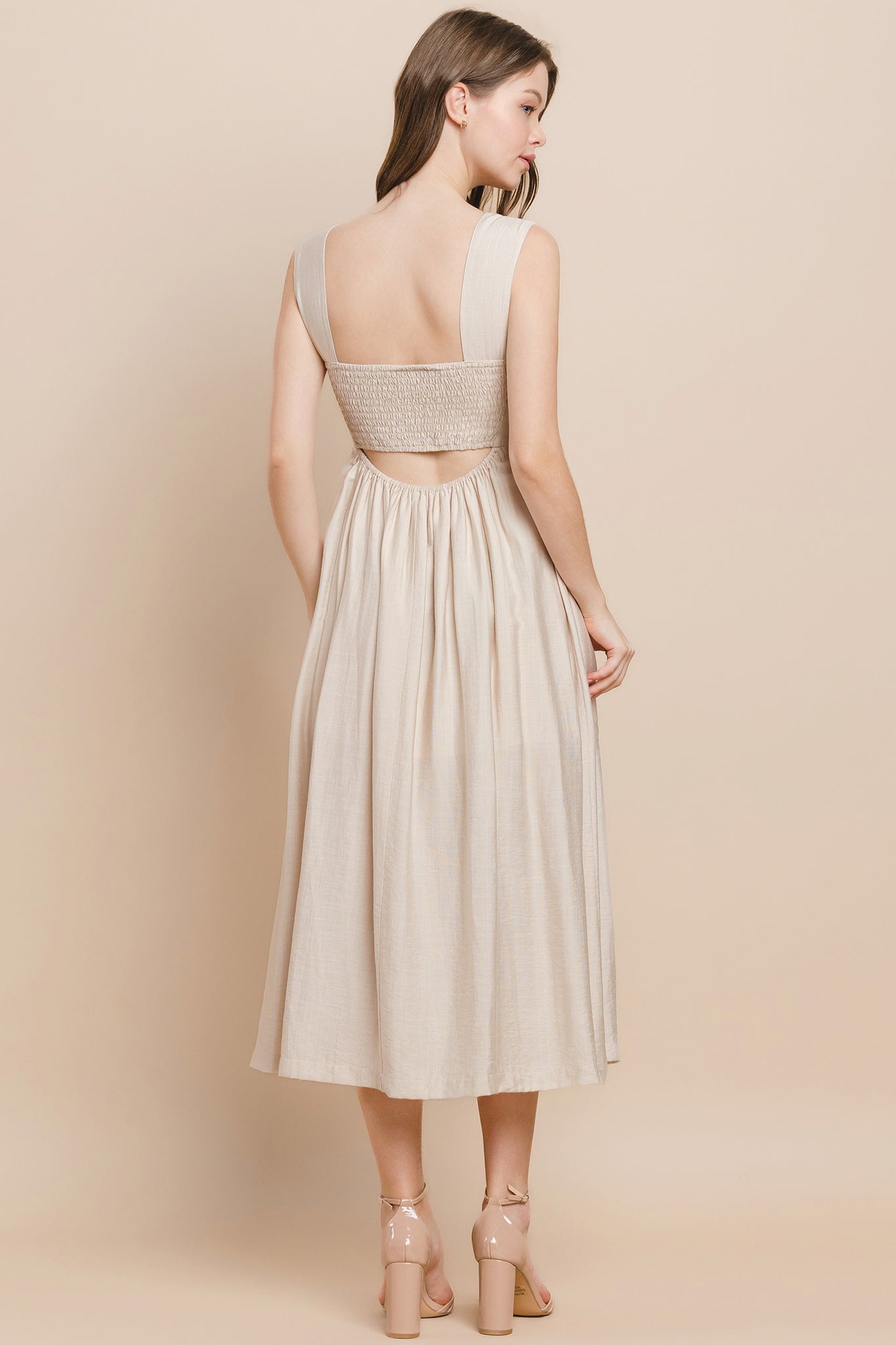 Elevate your wardrobe with our Let It Be Me Midi Dress! Designed with a scoop neckline and pleated detail, this midi dress is the perfect blend of class and style. The smock back and open back detail add a touch of elegance, while the beige color is both versatile and chic. Dress it up or down, perfect for any occasion.