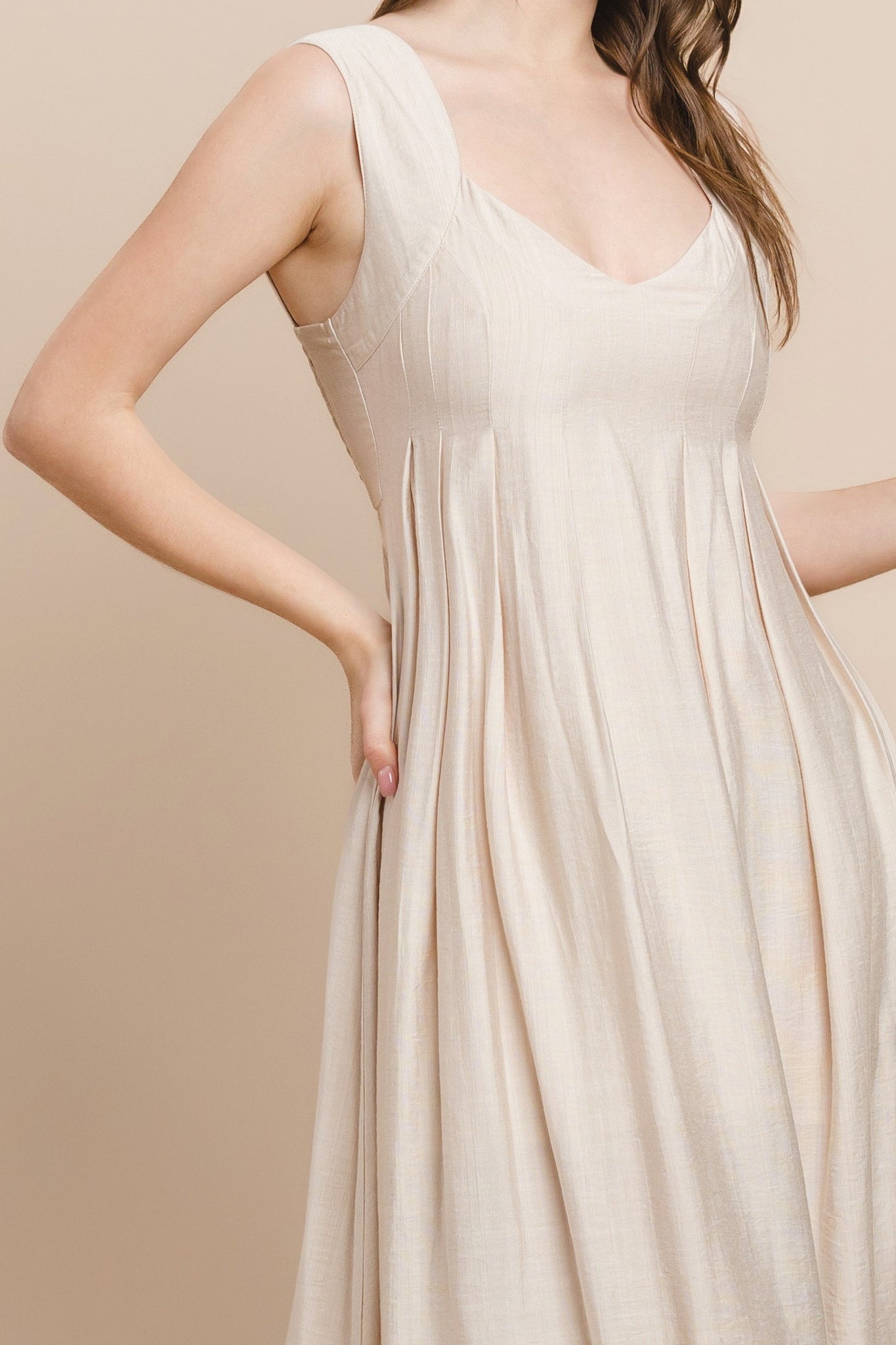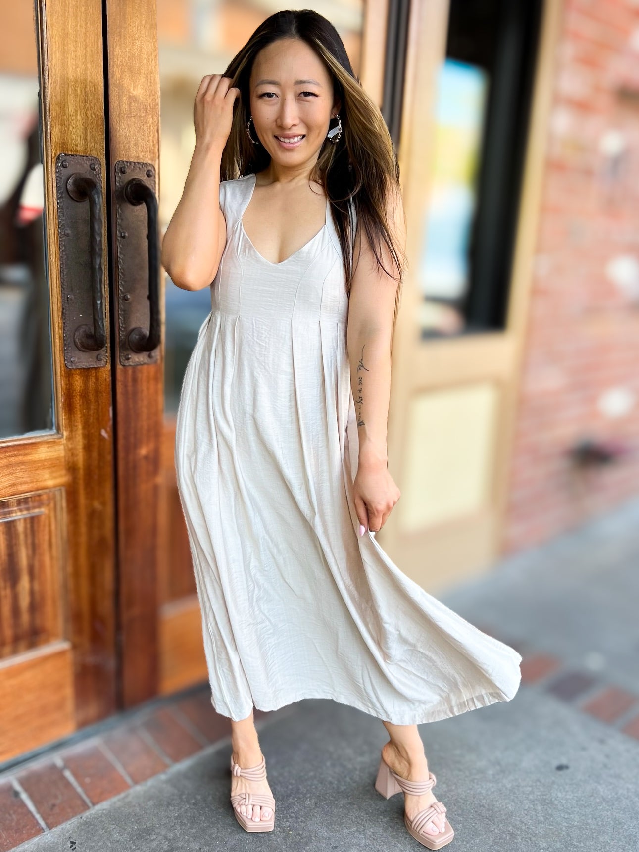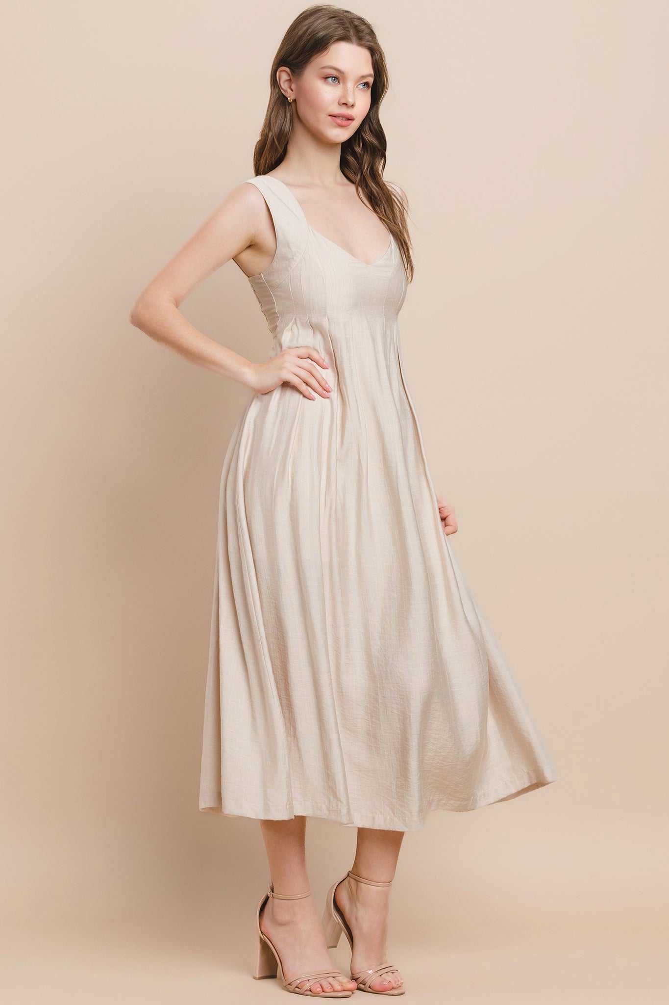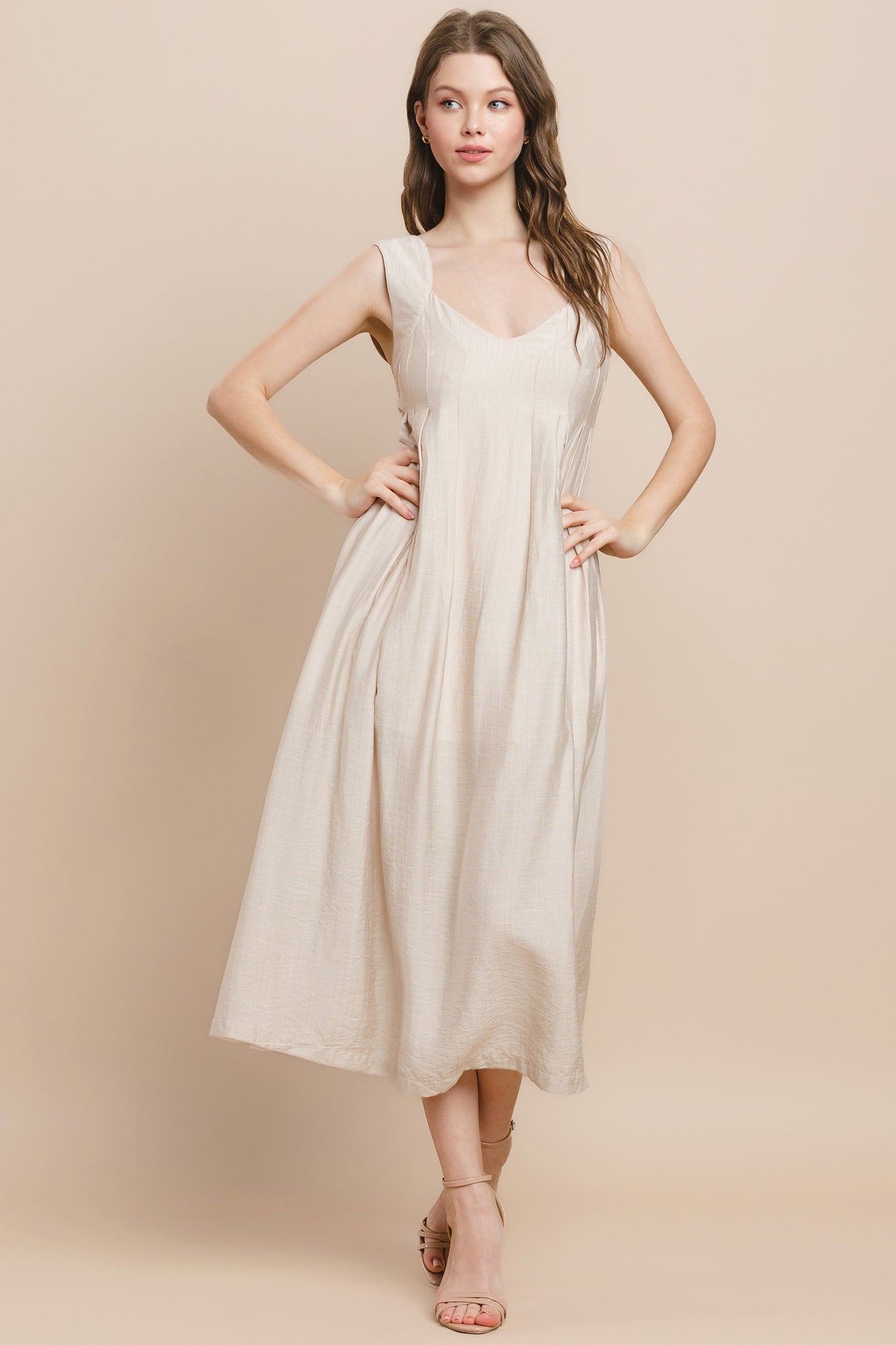 Elevate your wardrobe with our Let It Be Me Midi Dress! Designed with a scoop neckline and pleated detail, this midi dress is the perfect blend of class and style. The smock back and open back detail add a touch of elegance, while the beige color is both versatile and chic. Dress it up or down, perfect for any occasion.