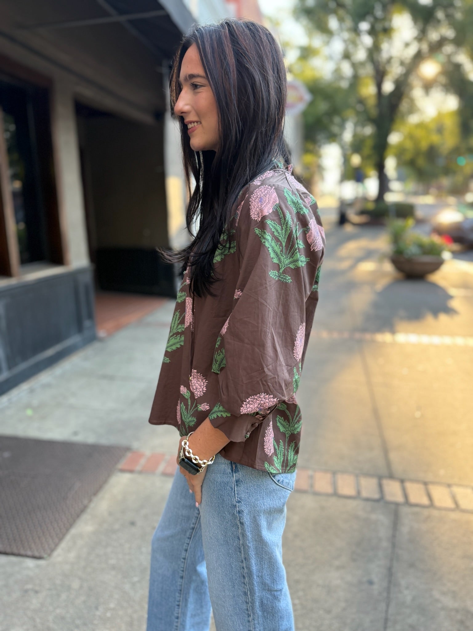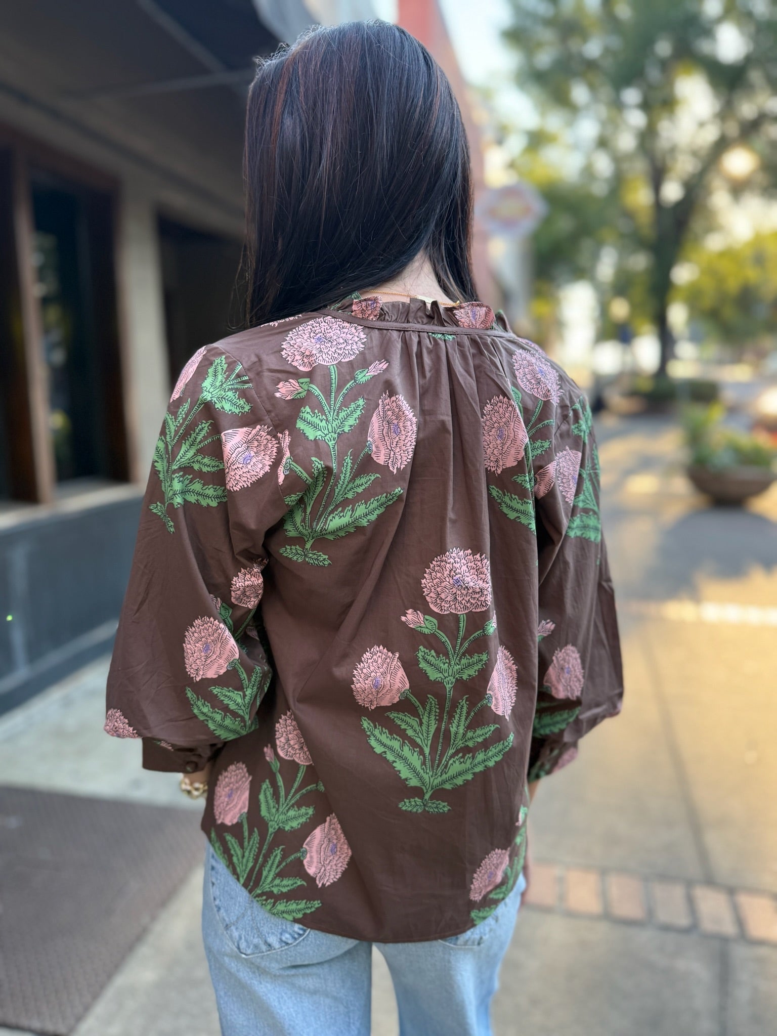 Add effortless elegance to your wardrobe with the Meadow Bloom Peasant Blouse. Crafted in a rich chocolate brown, this airy top is adorned with soft botanical florals in earthy greens and blush tones for a timeless, feminine touch. Featuring voluminous sleeves, a relaxed silhouette, and a tie-front neckline with delicate tassel details, it’s the perfect blend of casual sophistication and boho charm. Pair it with tailored trousers for polished style or denim for a chic everyday look.