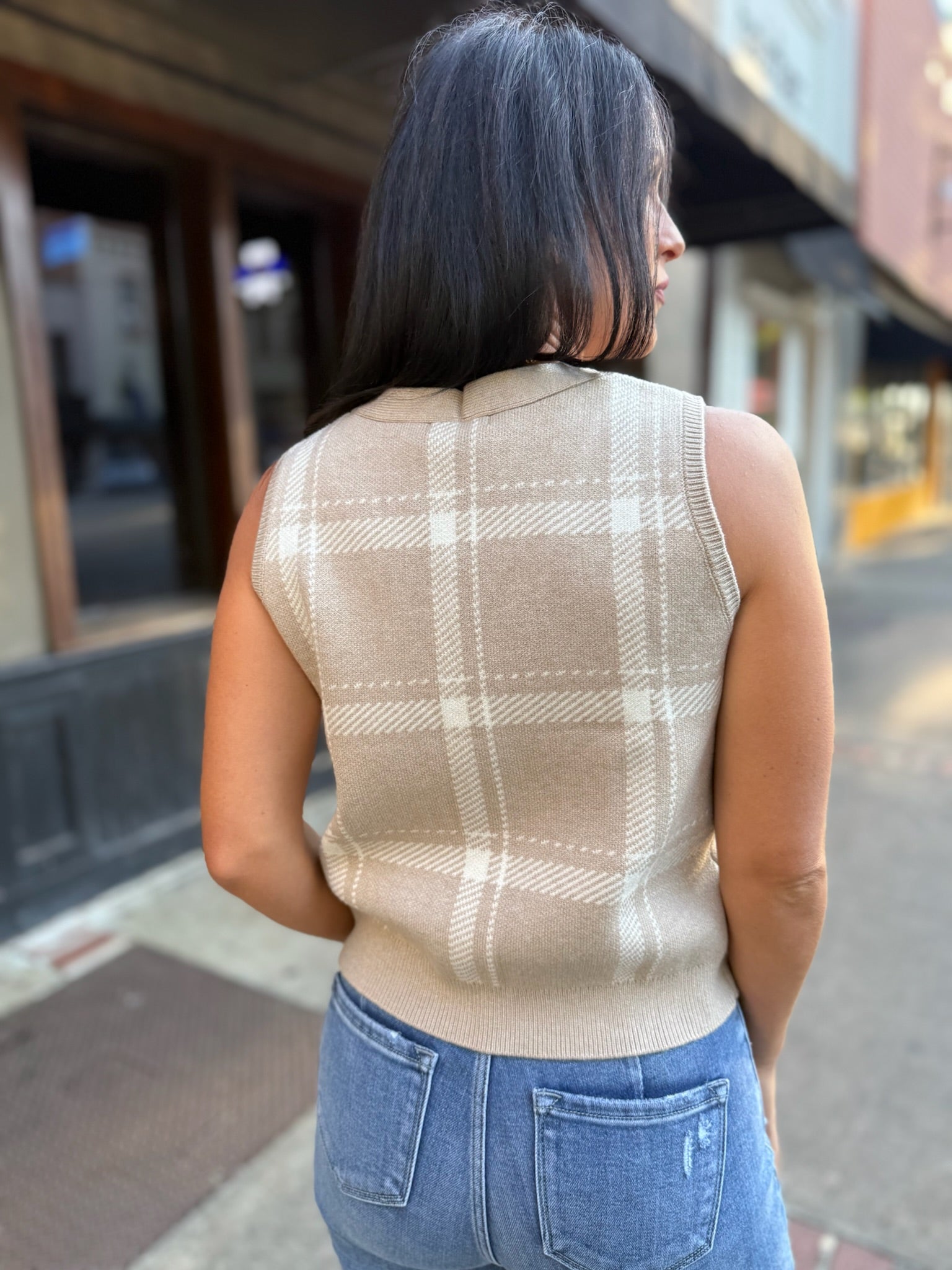 The Oliver Plaid Sweater Vest - Crystal blends timeless style with modern polish. This sleeveless knit vest features a soft beige plaid pattern with a flattering V-neckline and button-down front. Ribbed trim adds structure, while the cropped fit makes it perfect for layering over shirts or pairing with high-waisted trousers for a refined, preppy look.