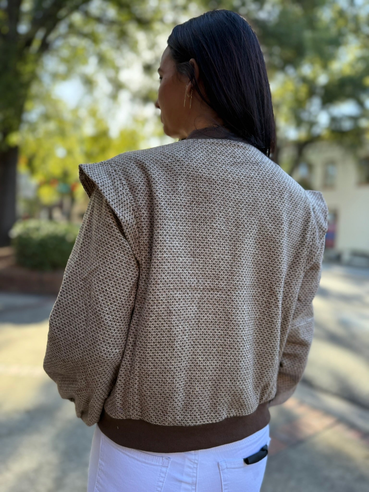 Taupe/Brown Perforated Pattern Ruffle Detail Bomber Jacket