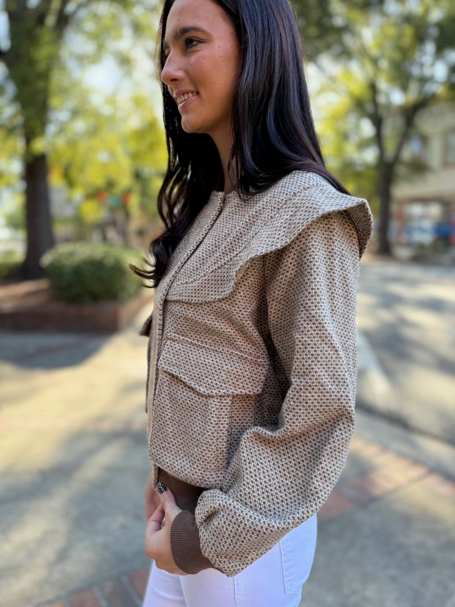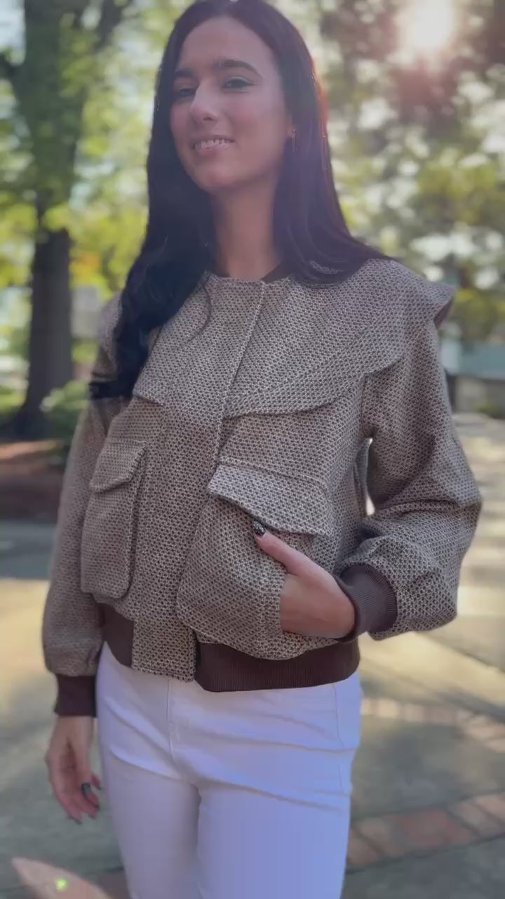 Add a unique twist to your outerwear with the Taupe/Brown Perforated Pattern Ruffle Detail Bomber Jacket. Featuring a chic perforated design, playful ruffle accents, and functional front pockets, this bomber blends casual cool with feminine flair. Perfect for layering over jeans or dresses, it’s your go-to piece for style that stands out.