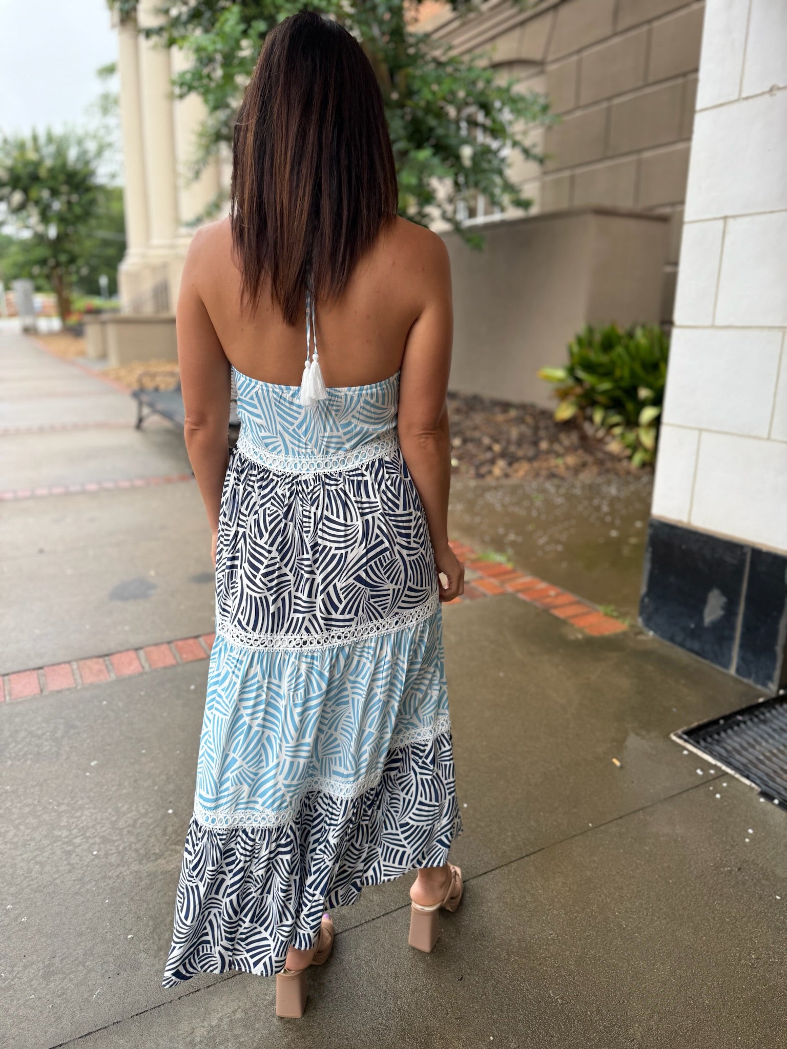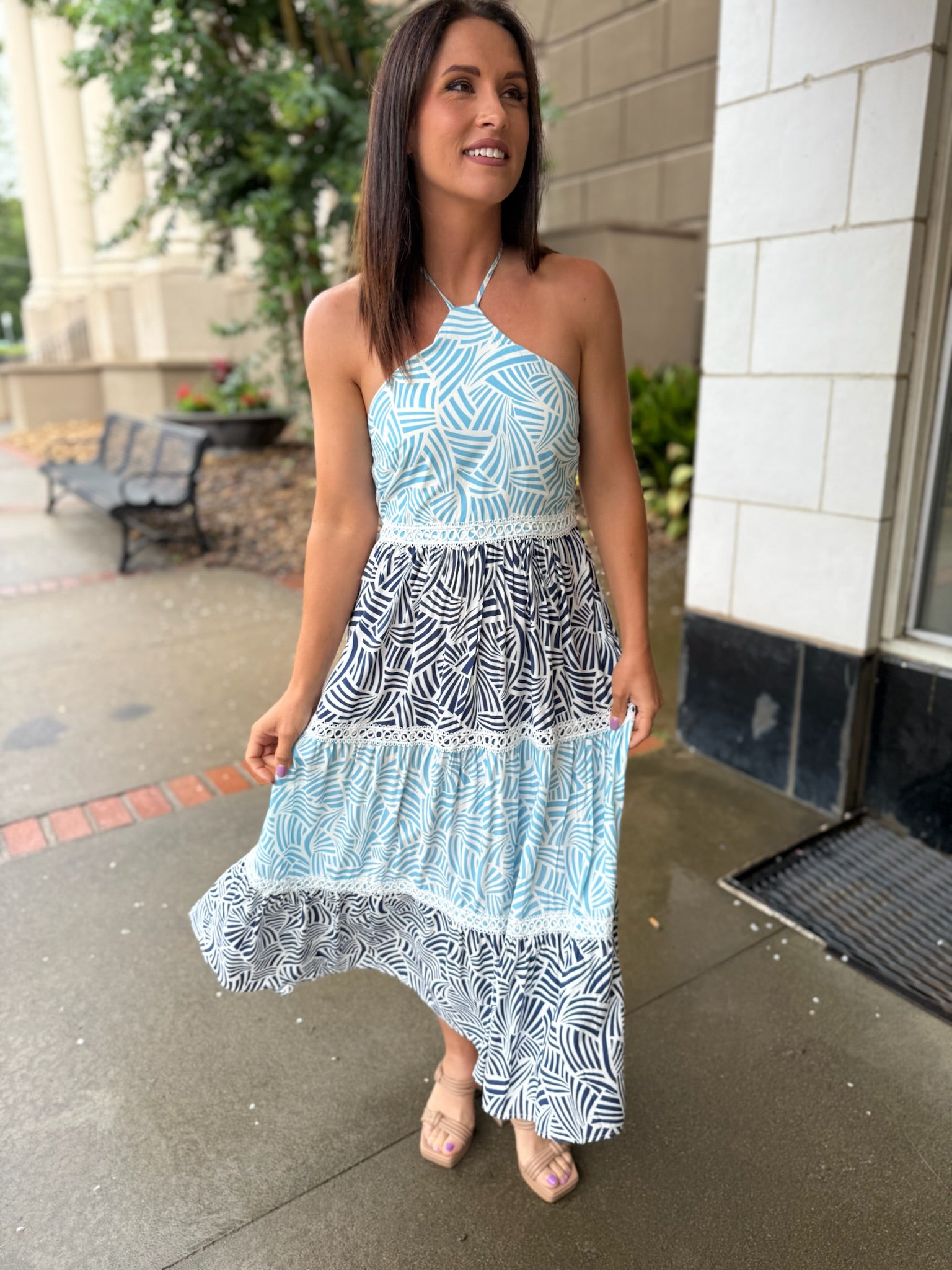 The contrasting blue and navy leaf-print panels create a dynamic visual effect, while delicate lace trim adds a hint of romance to the contemporary design. The halter top beautifully highlights the shoulders and neckline, giving this dress an effortlessly feminine edge.