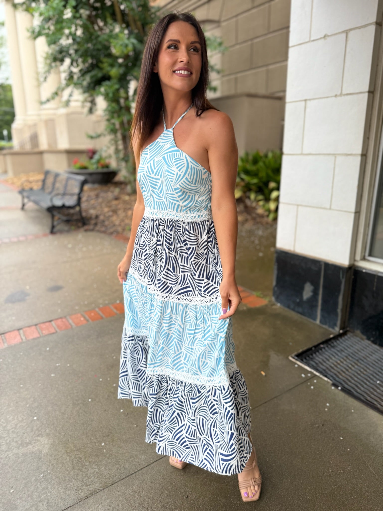 Turn heads in this Blue/Navy Halter Top Dress—a striking statement piece that blends breezy elegance with bold, modern flair. Featuring a chic halter neckline and a flattering tiered silhouette, this dress is the perfect pick for beachside dinners, summer events, or tropical getaways.