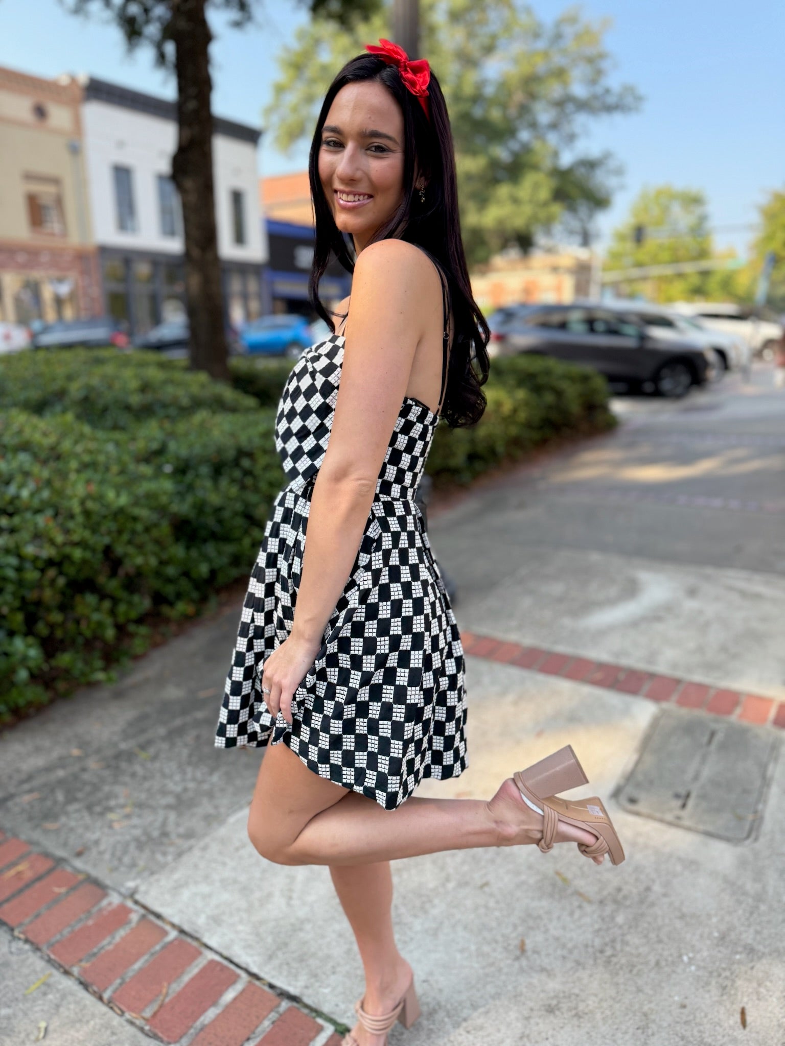 This eye-catching mini brings the fun with a bold black-and-cream checkerboard print, while the dainty front bow adds just the right touch of sweetness. The fitted bodice and flared skirt create a flattering silhouette that moves with ease and attitude.