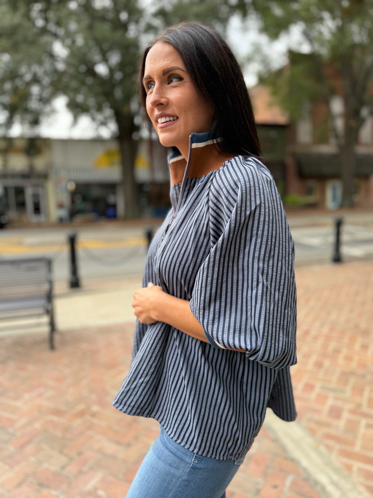 3/4 Sleeve Half Zip Striped Top