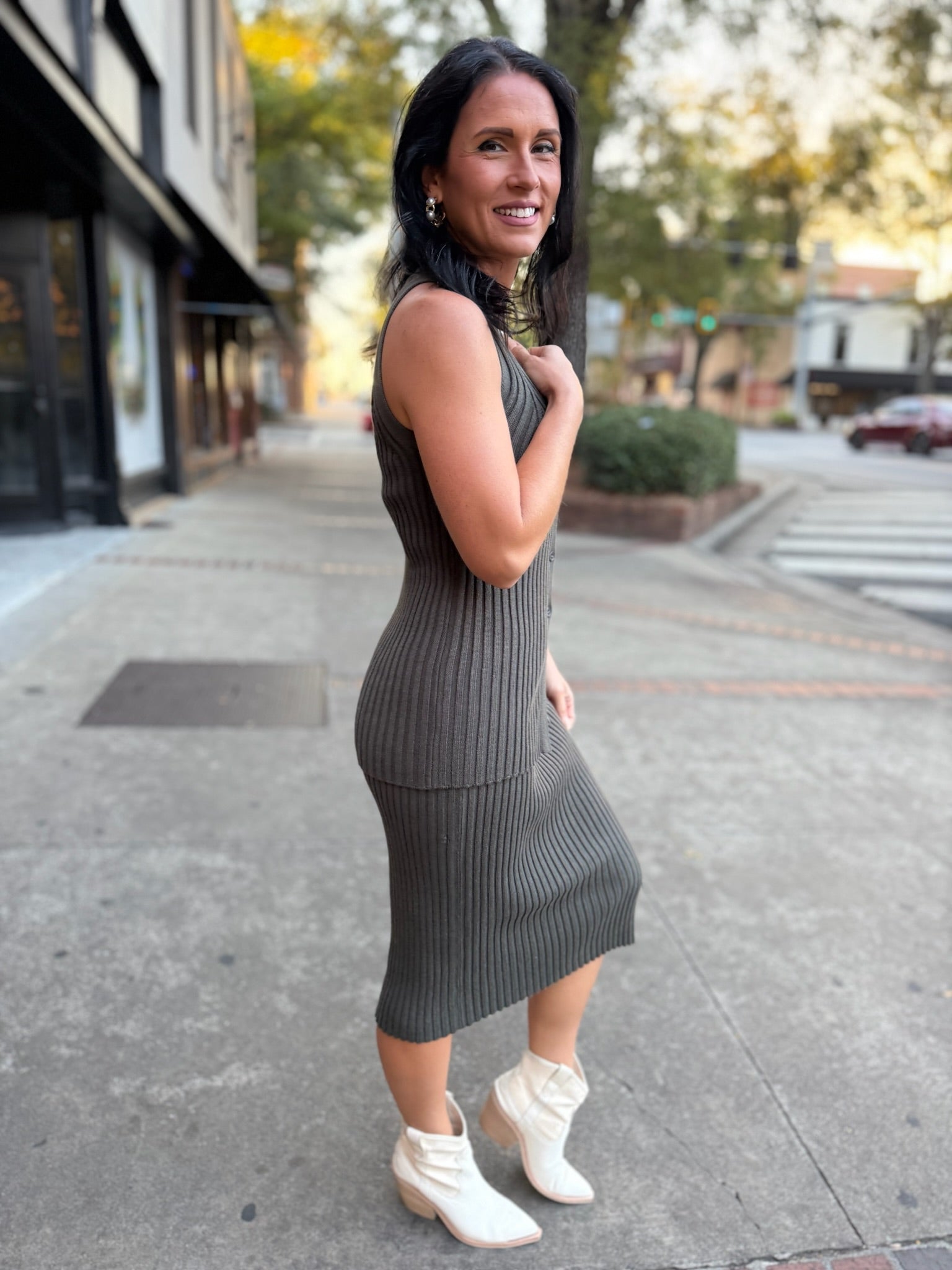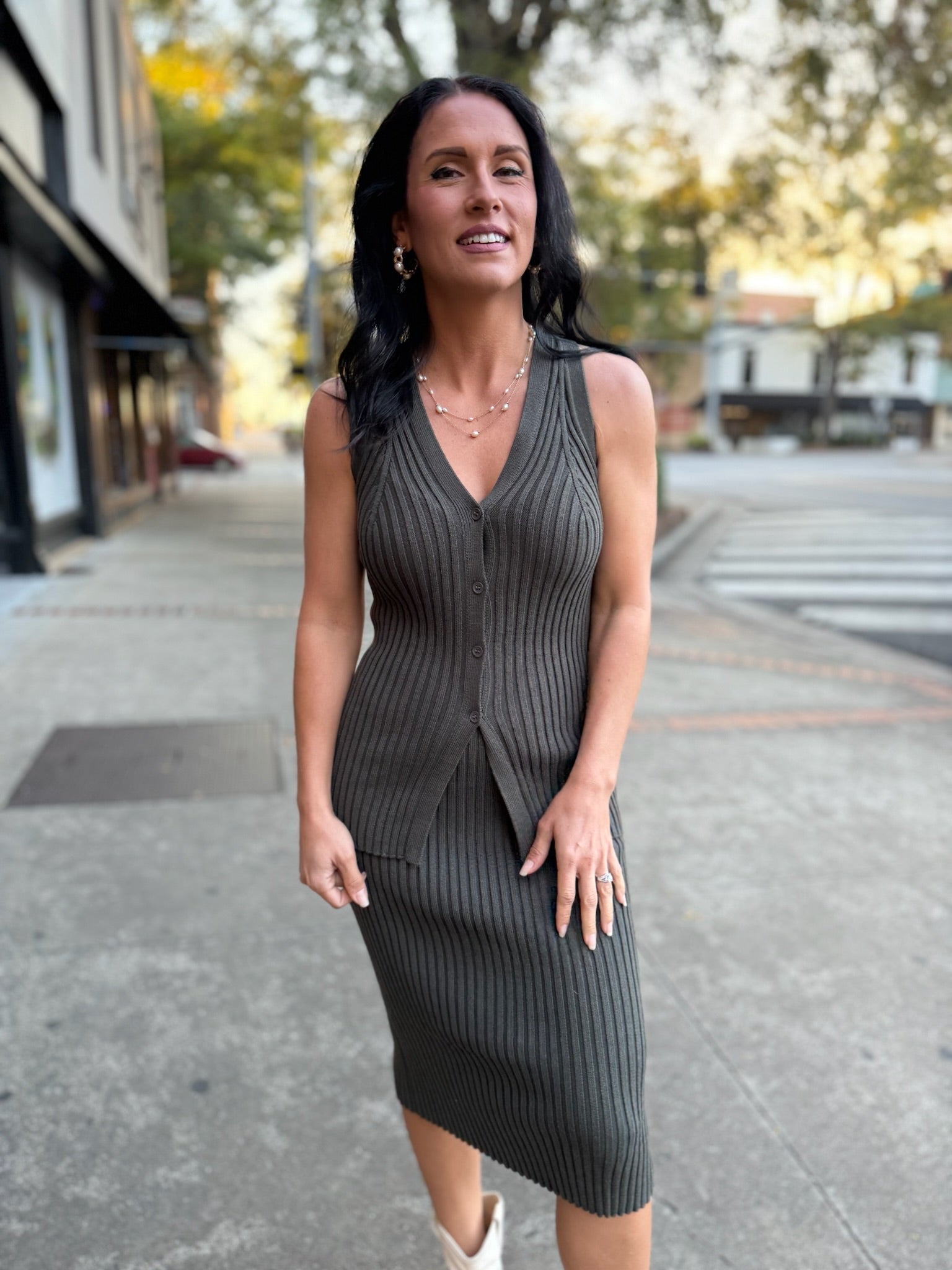 The Olive Ribbed Knit Midi Skirt is your go-to piece for chic, all-day style. Crafted from a soft, stretchy ribbed knit, it hugs your figure in all the right places while offering effortless comfort. The midi length adds a sophisticated touch, making it perfect to pair with a matching top for a sleek set or a cozy sweater for a more relaxed vibe.