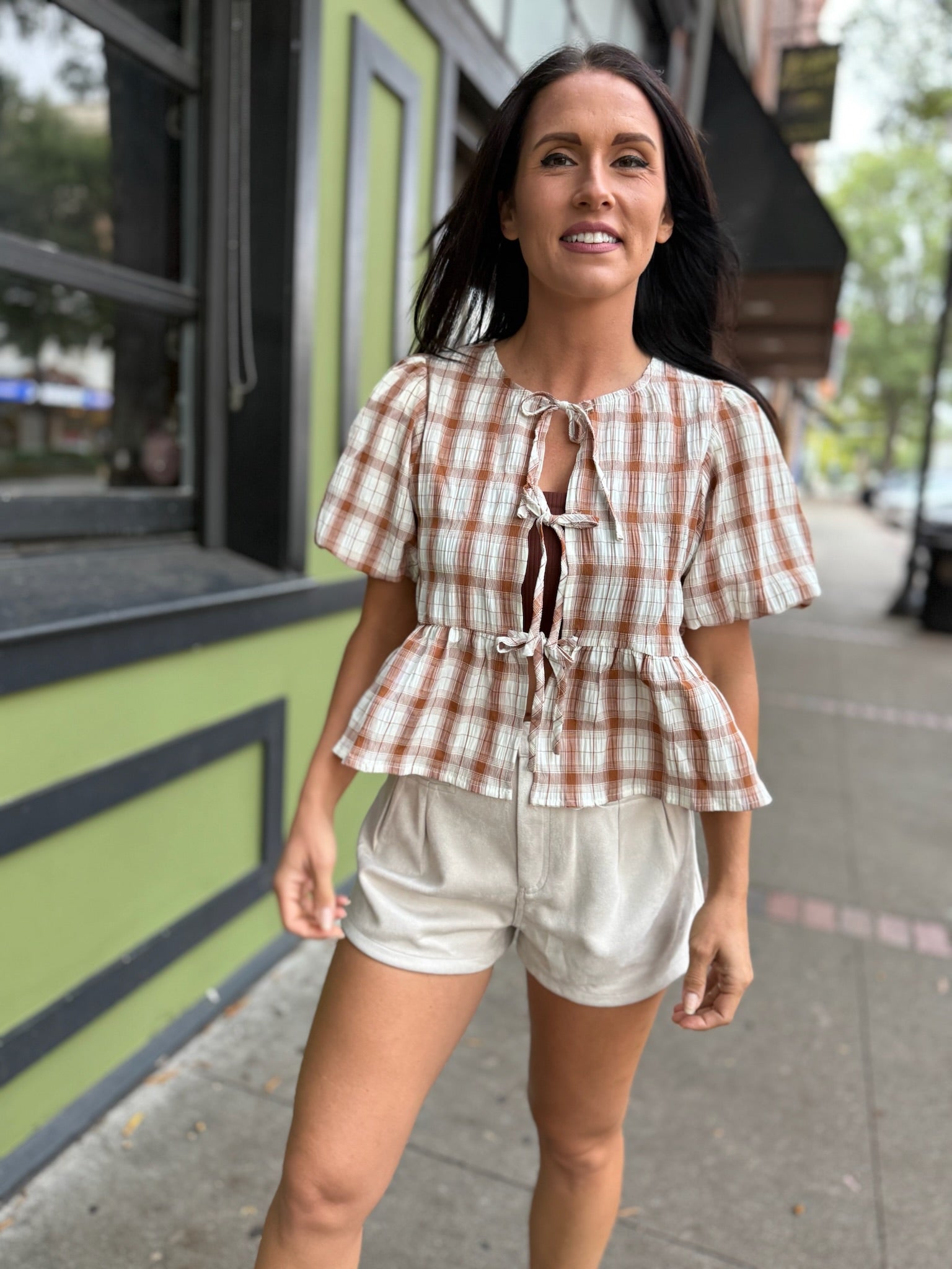Chic and versatile, these soft suede-feel shorts feature front pleats and tailored seams for a polished fit. Their neutral sand hue makes them an effortless match for cozy sweaters, plaid tops, or sleek going-out looks. A timeless base piece for fall layering.