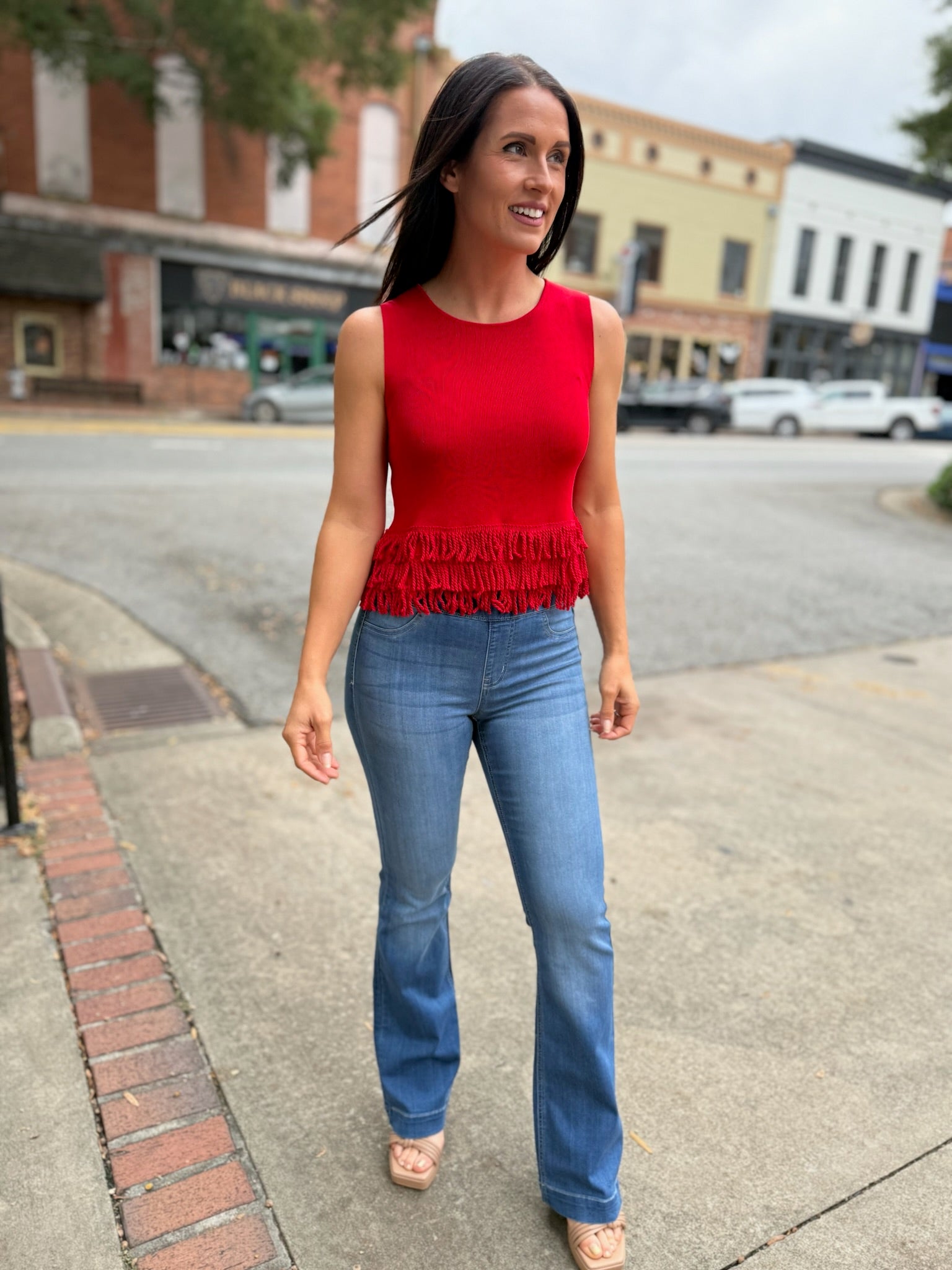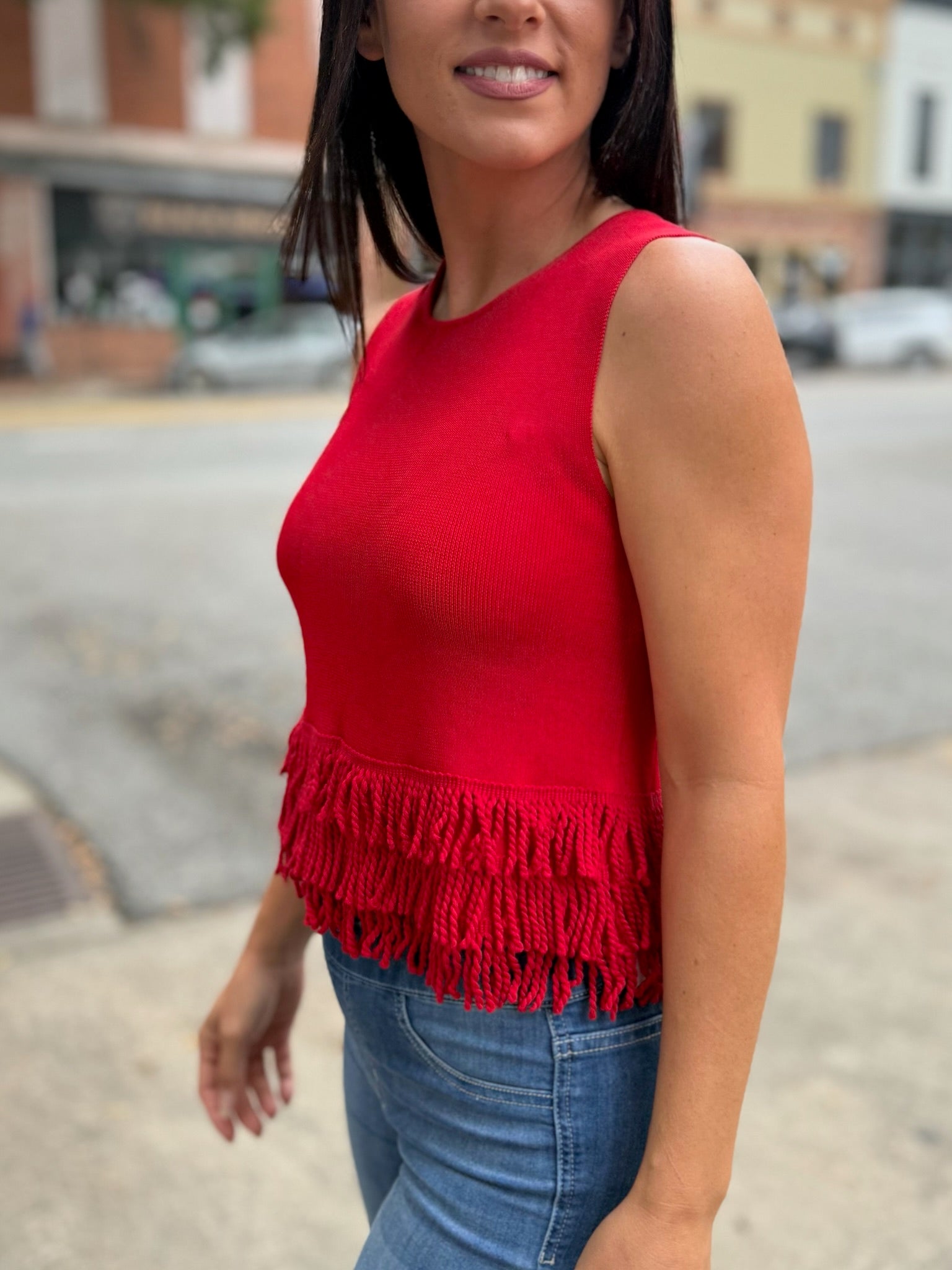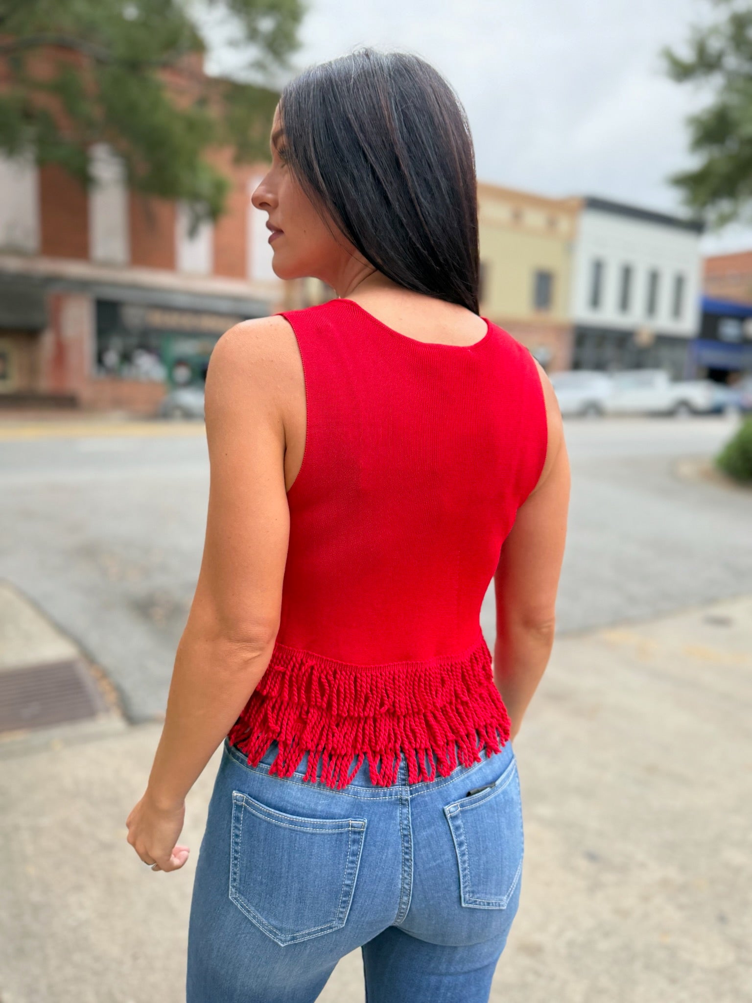 Bold and playful, this fiery red knit tank turns heads with its fringe hemline detail. Cropped to perfection, it pairs seamlessly with high-waist skirts or trousers for a fun night-out vibe. A statement piece that’s equal parts flirty and fierce.