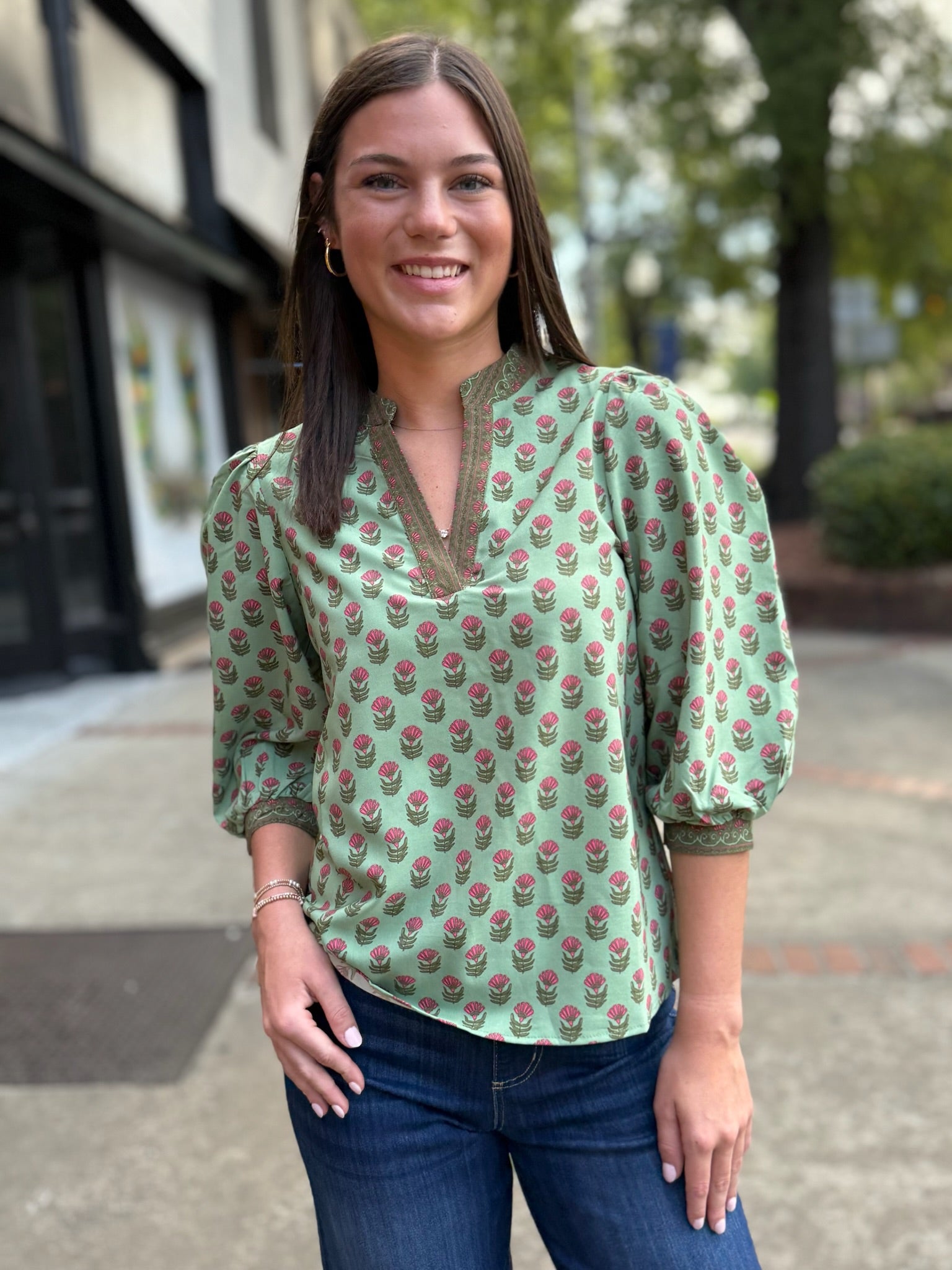 This minty-green blouse is a true day-brightener with its playful floral print and easy silhouette. The split neckline features a subtle embroidered trim that adds a polished touch, while the three-quarter sleeves with gathered cuffs keep it breezy and feminine. Effortlessly pair it with denim for a casual outing or dress it up with white trousers for a fresh, chic look. It’s the perfect blend of comfort and charm—your go-to top for workdays, weekends, and everything in between.