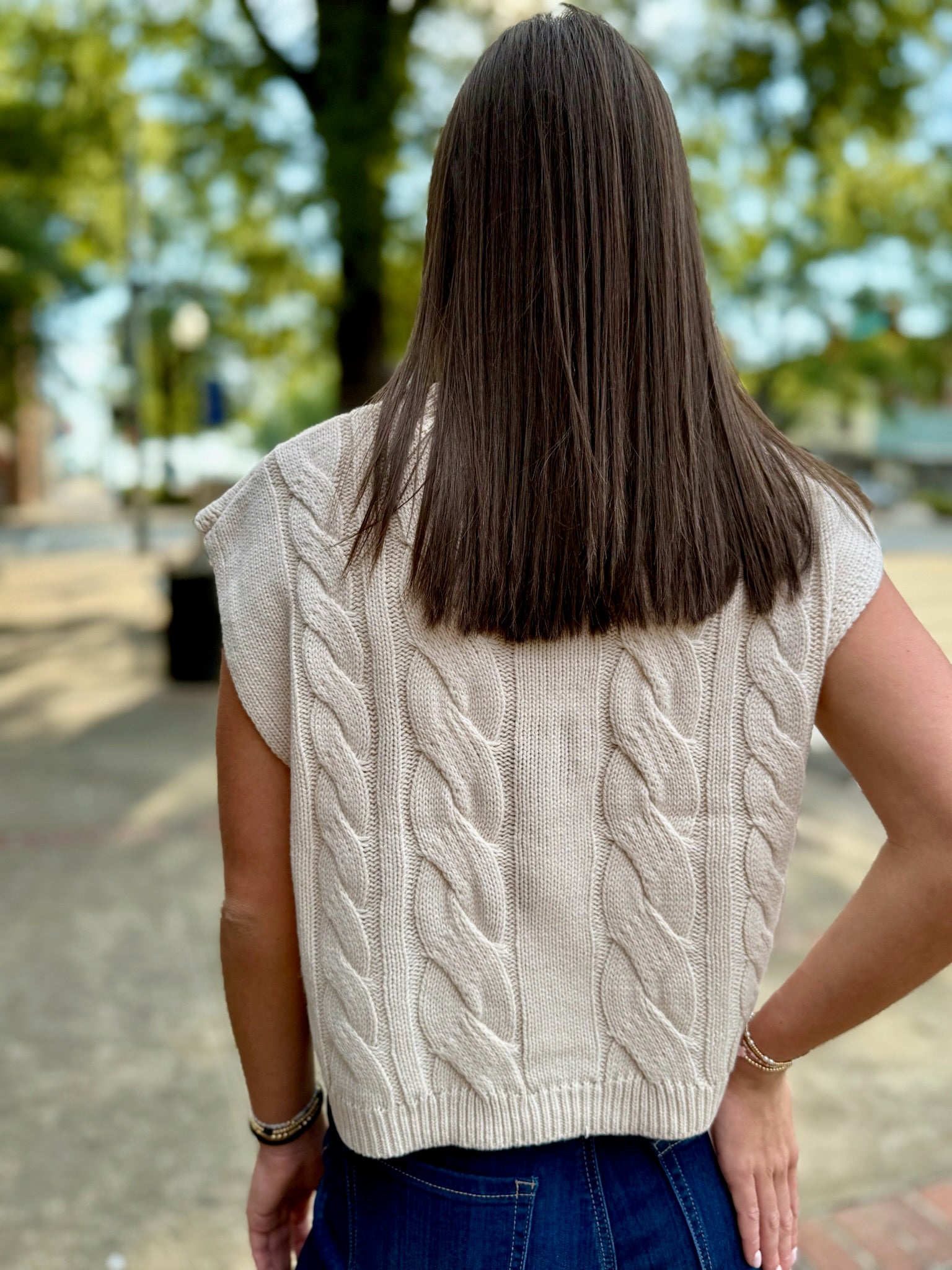 Introducing the epitome of transitional style, the chic cable knit sleeveless sweater, designed for both comfort and versatility. Crafted with an intricate cable knit pattern, this sweater features a unique, sleeveless silhouette that exudes a casual yet refined aesthetic. The side button details not only enhance its visual appeal but also offer slight adjustability for a personalized fit.