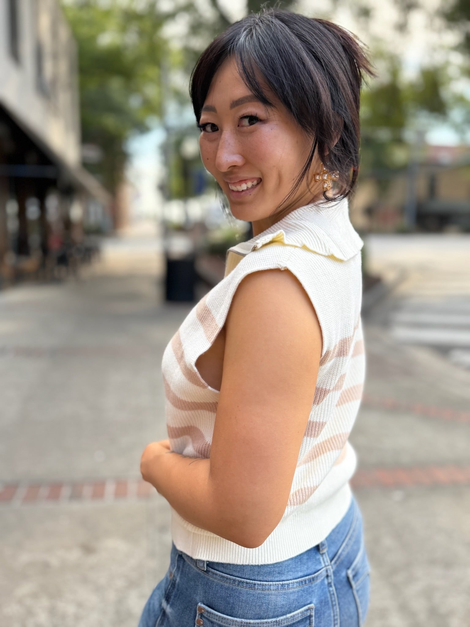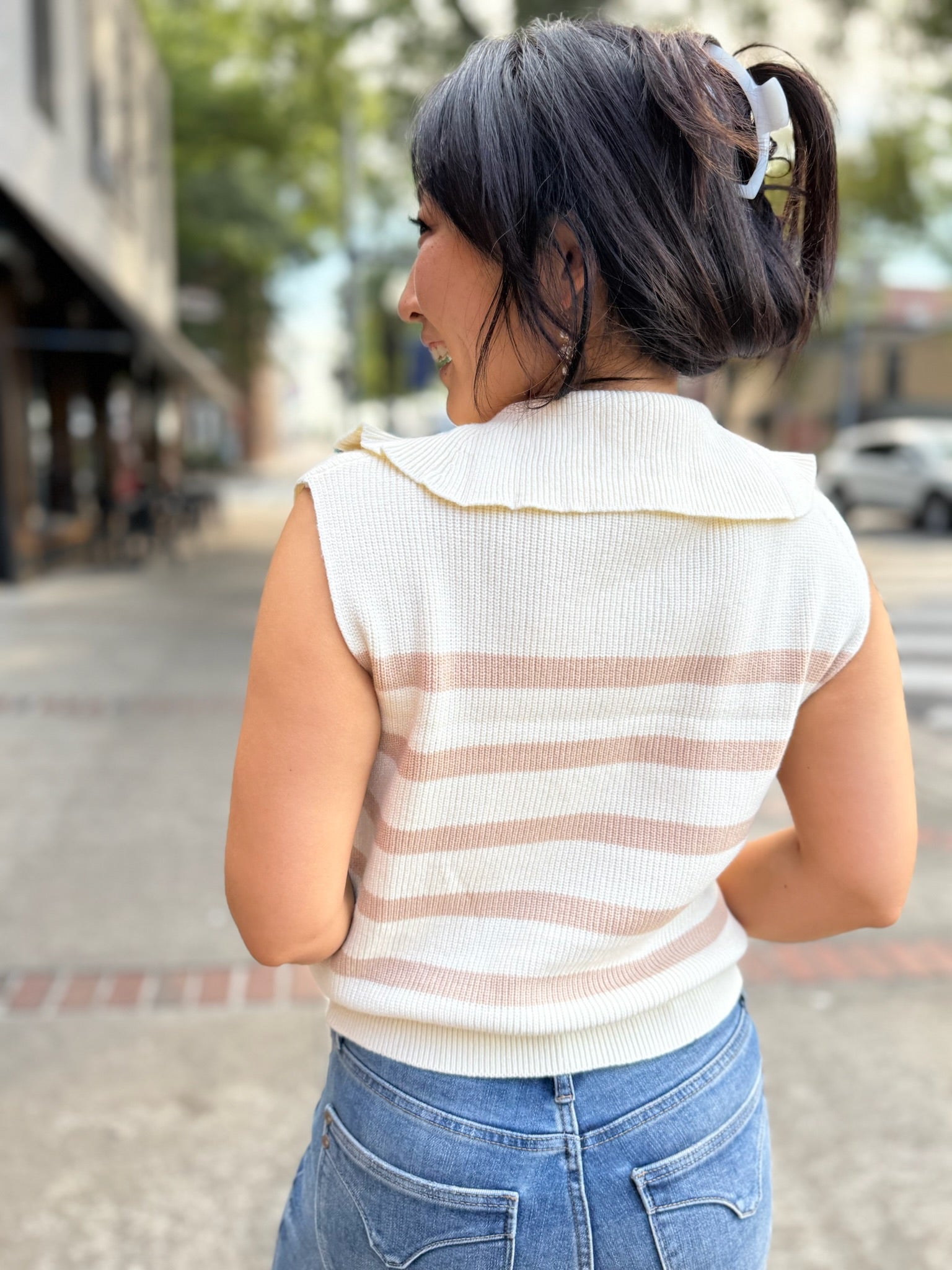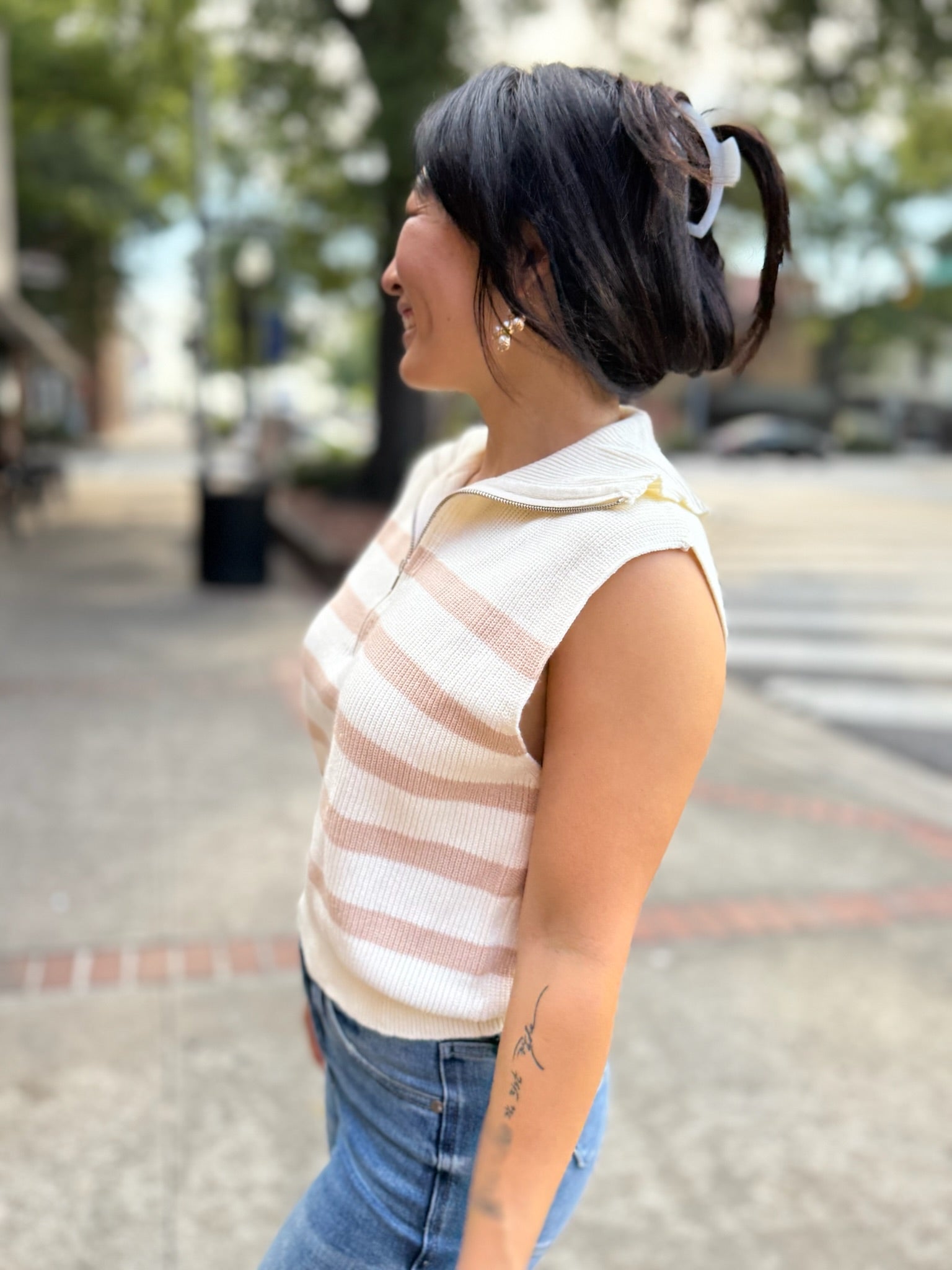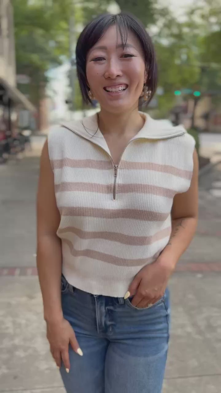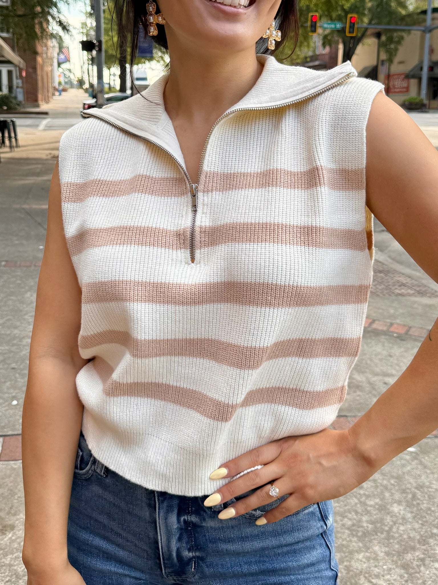 Cream/Taupe Striped Knit Half Zip Sweater Vest