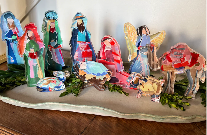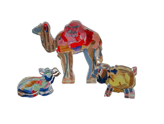 What nativity set is complete without the animals for the birth of baby Jesus!?!?  These unique animals pair with our acrylic nativity set. Lauren turned her unique collage work into a special 3-piece set of free standing acrylic animals including a camel and 2 precious sheep.