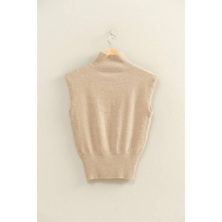 Embrace style with this sleeveless knit top featuring a fitted high neck and slightly extended shoulders for a relaxed, comfortable fit. The ribbed hem hugs the body for a sleek silhouette. Perfect for layering or wearing alone, it pairs effortlessly with skirts or trousers. Its minimalist design adds subtle sophistication, ideal for casual outings.
