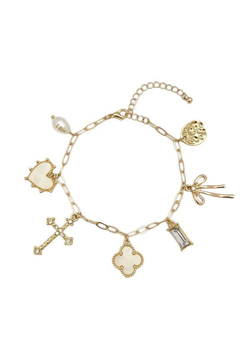 Add a touch of sophistication and sentiment to your wrist with the Charmed Elegance Bracelet! This exquisite bracelet features a stunning combination of mother of pearl clover, sparkling stone, heart, and bow charms, each carefully crafted to symbolize love, luck, and grace. The lustrous mother of pearl shines beautifully, while the charms create a harmonious blend of style and meaning. With an extension chain for a perfect fit, this bracelet is ideal for layering or wearing alone, making it a versatile addition to any jewelry collection. Celebrate your unique style and cherished moments with the Charmed Elegance Bracelet!