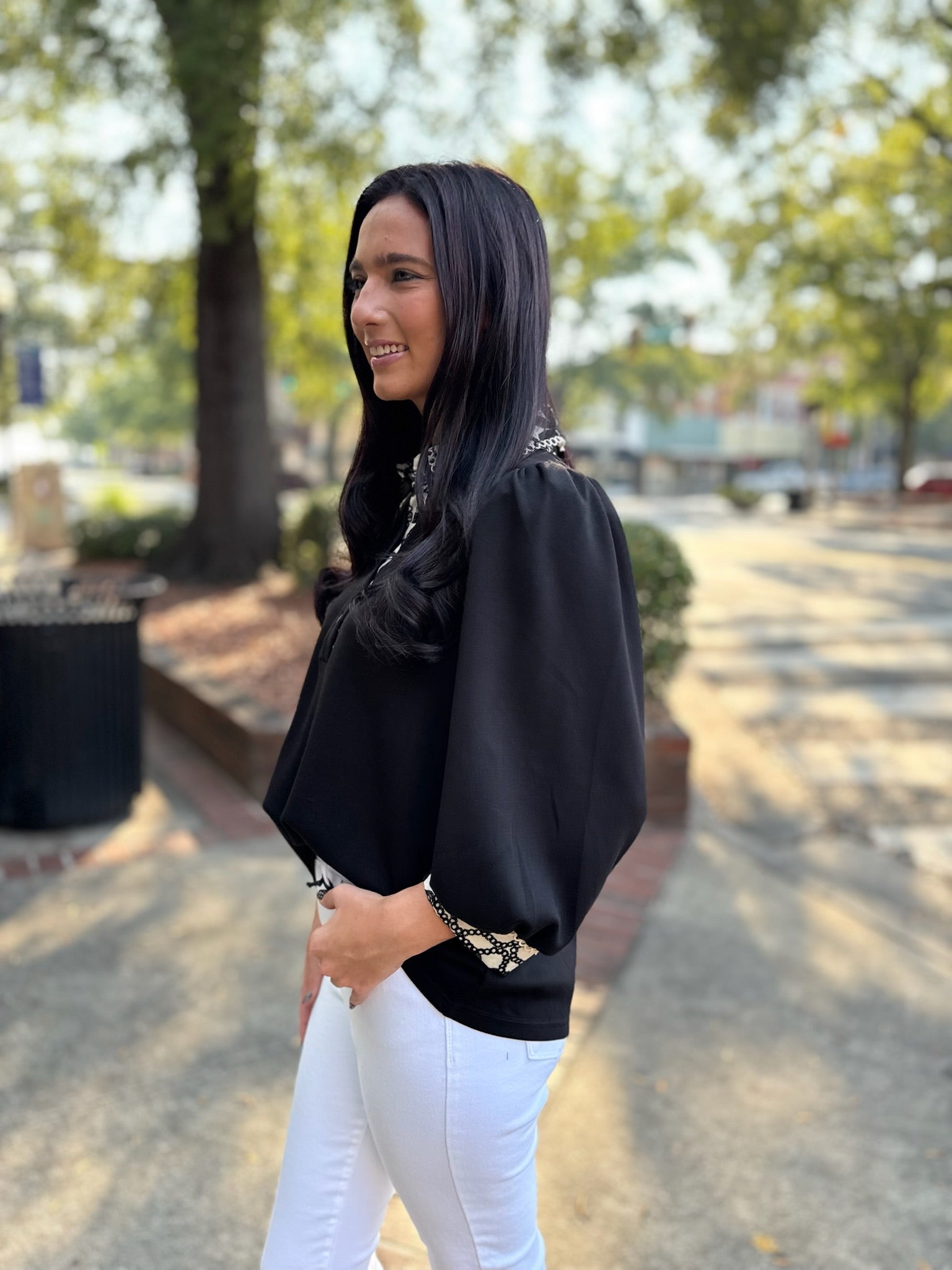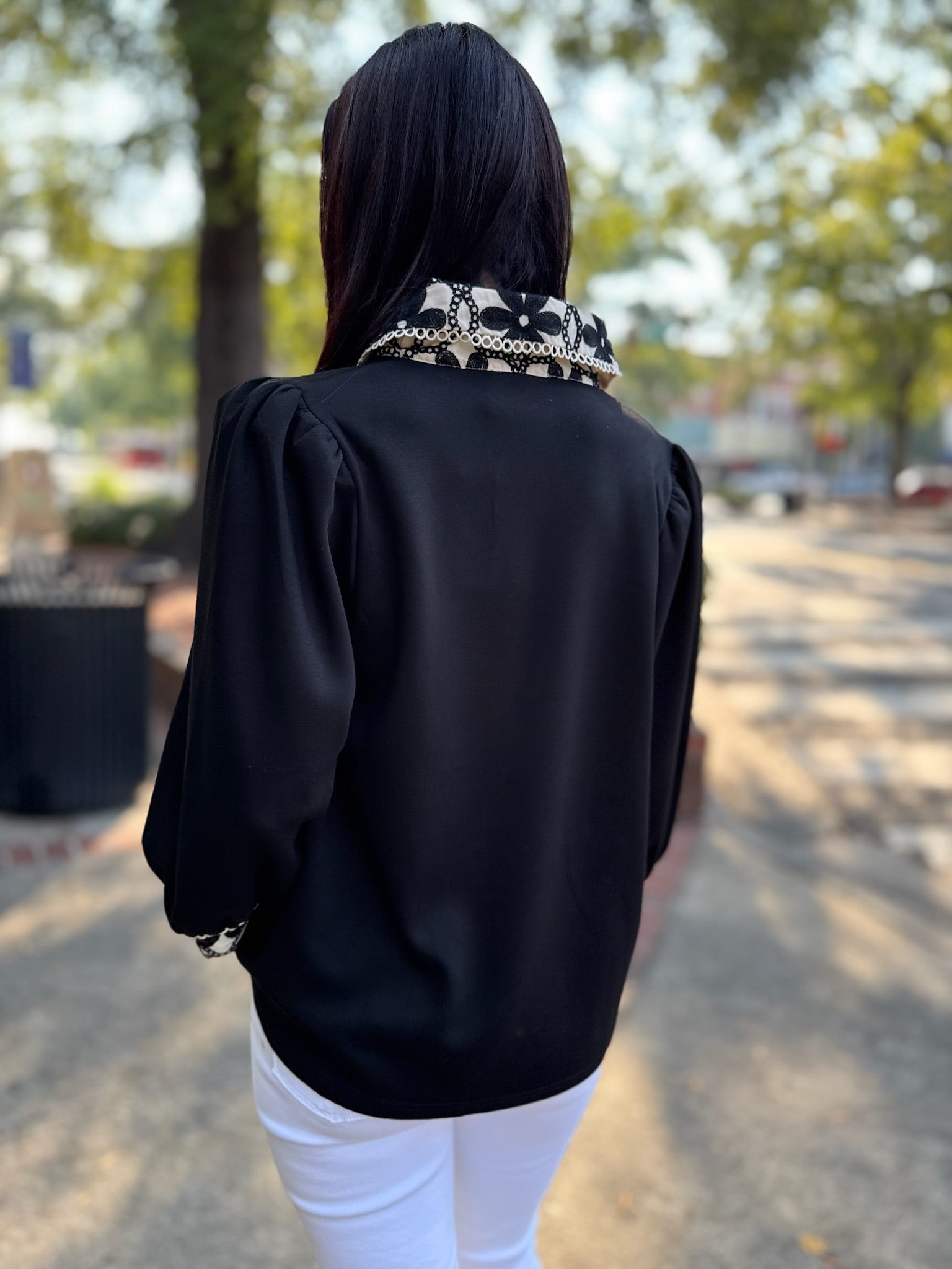 A polished take on a classic black top, the Midnight Garden Blouse features a statement embroidered collar and cuff detail in cream and black. The puffed 3/4 sleeves and button-front neckline give it a feminine yet tailored touch—perfect for dressing up denim or pairing with trousers for work. Effortless, elevated, and endlessly wearable.